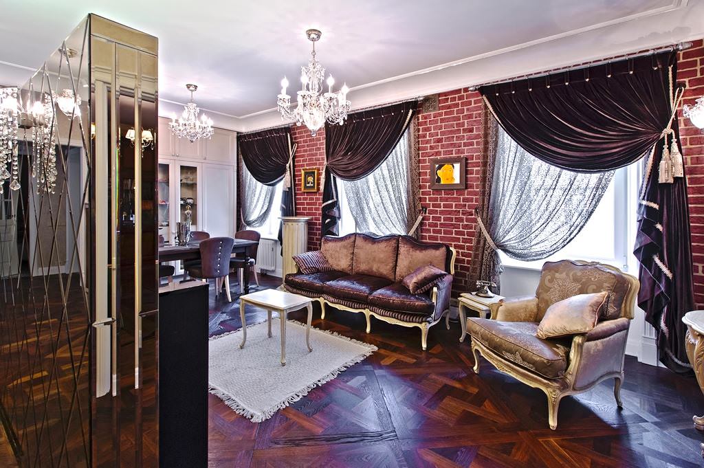 Les rideaux denses, qui sont situés sur les côtés de l'ouverture de la fenêtre, ont également retrouvé une grande popularité. C'est l'option classique et la plus pratique qui s'intègre parfaitement à l'intérieur de chaque salon. En plus des rideaux sombres, il sera avantageux d'utiliser du tulle, des accessoires de rideaux et des objets d'intérieur décoratifs inhabituels.