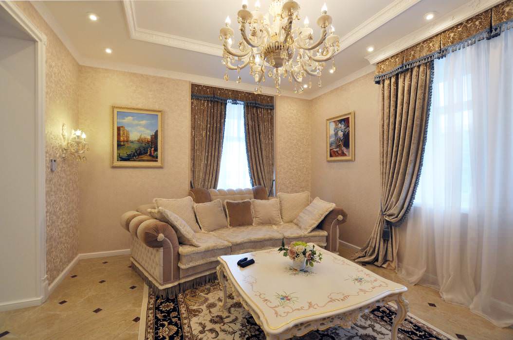 Le salon de couleur beige est complété par des rideaux d'un motif classique à la couleur des meubles rembourrés et crée une unité de design.