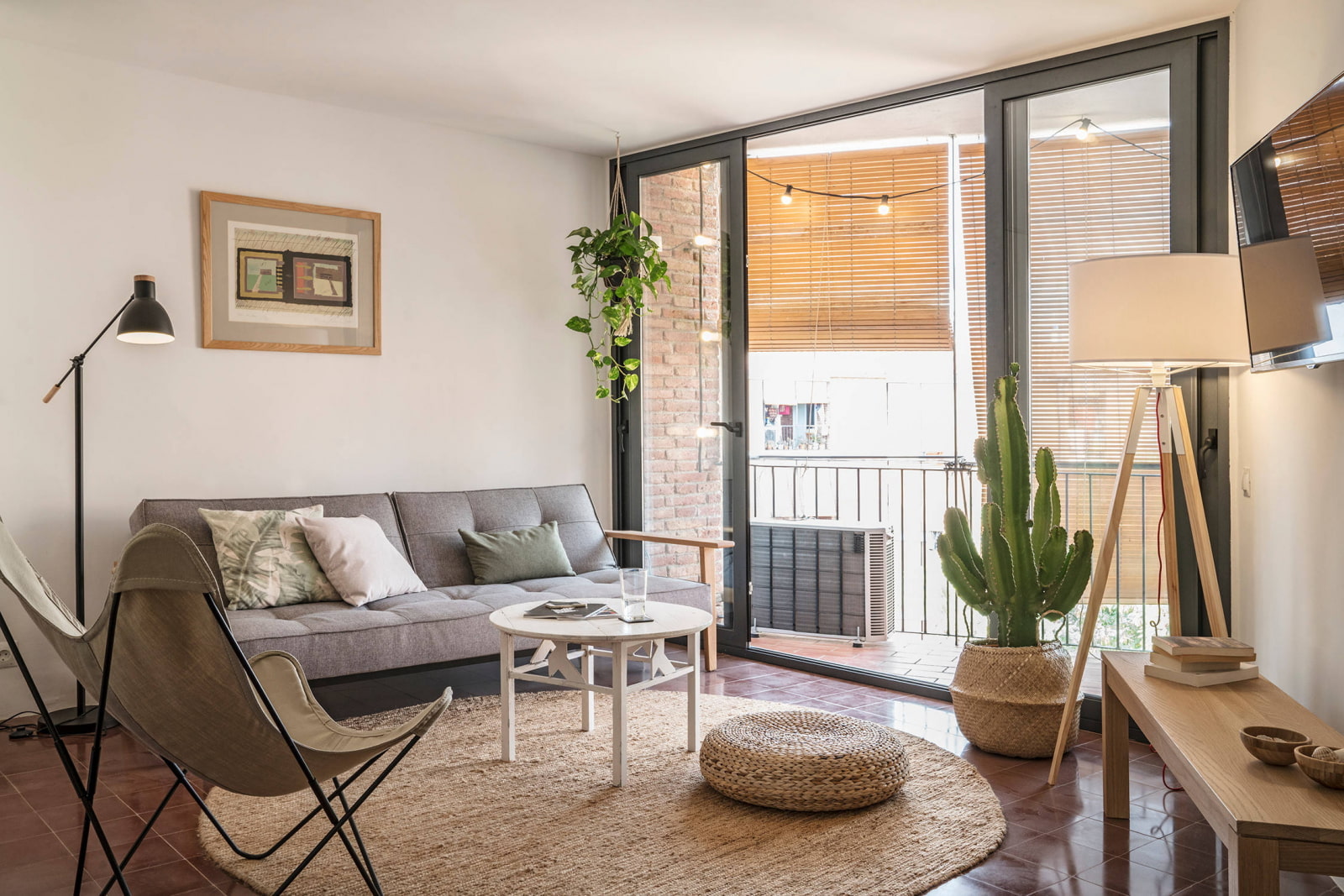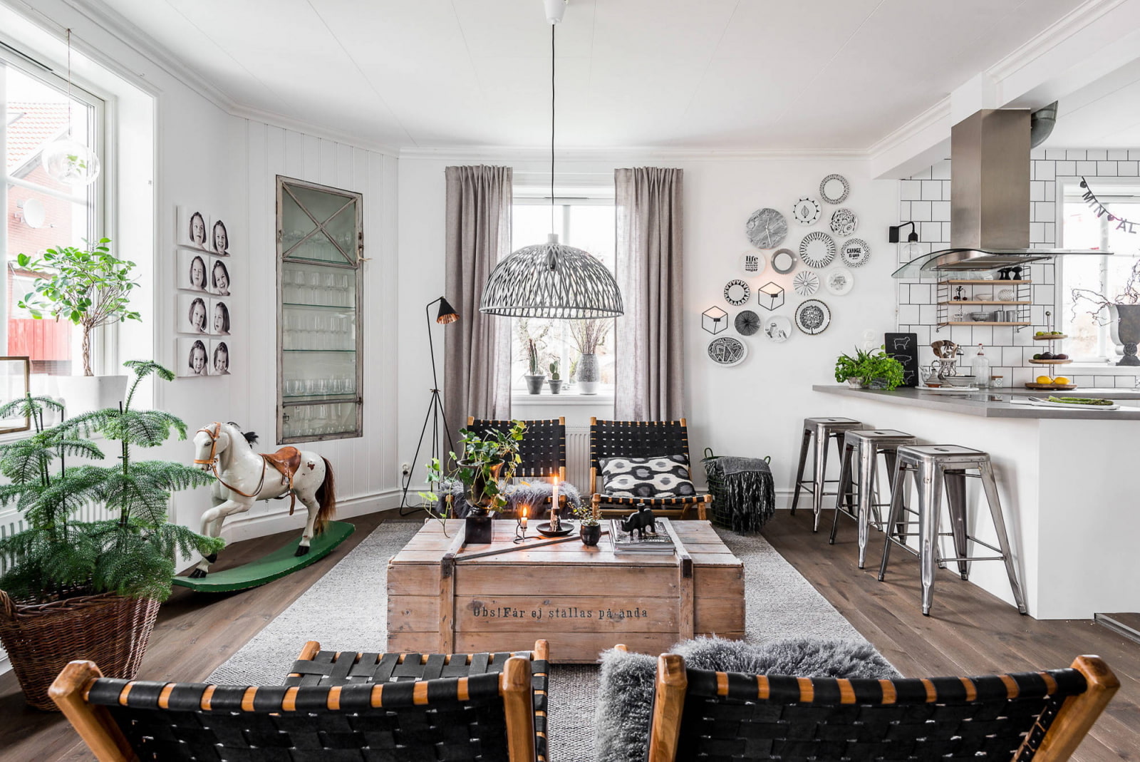 Lumineux éclairage de salon de style scandinave avec des ampoules suspendues à des cordons