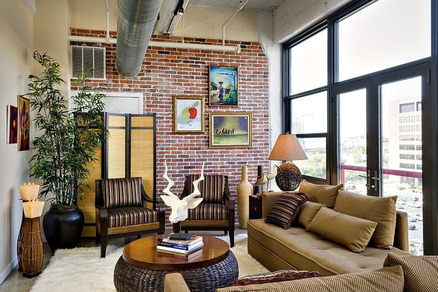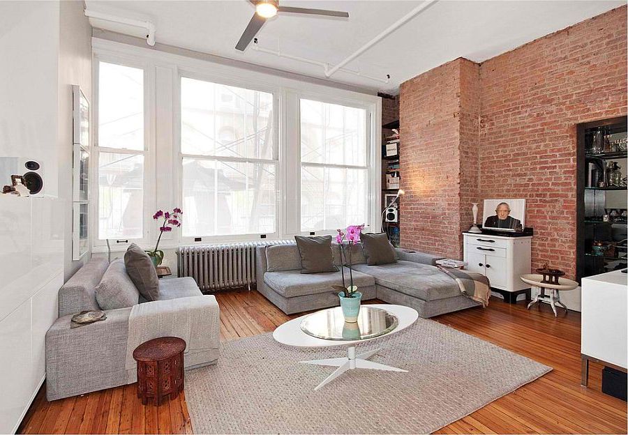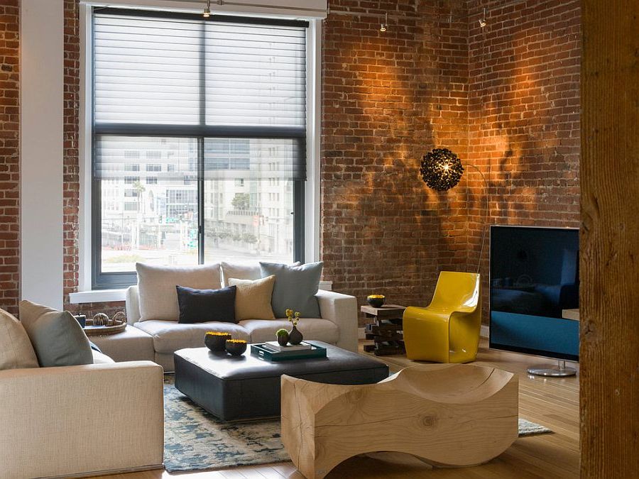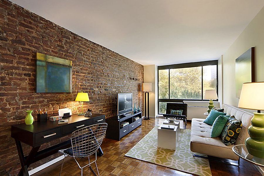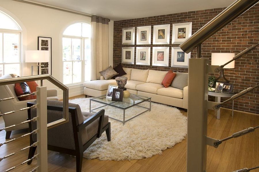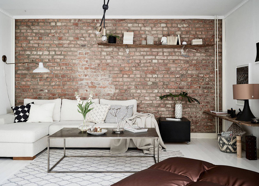Un salon avec des murs de briques peut devenir beaucoup plus attrayant visuellement, et les meubles de couleurs neutres deviendront plus visibles.