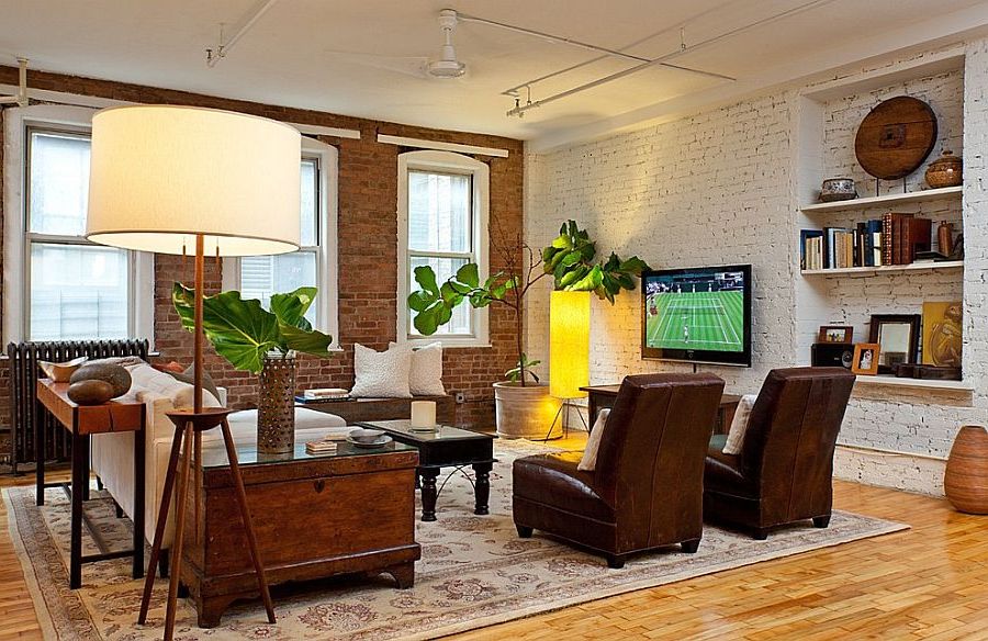 Le mur de brique rouge classique est certainement esthétique et prend sa place de leader dans le salon moderne.