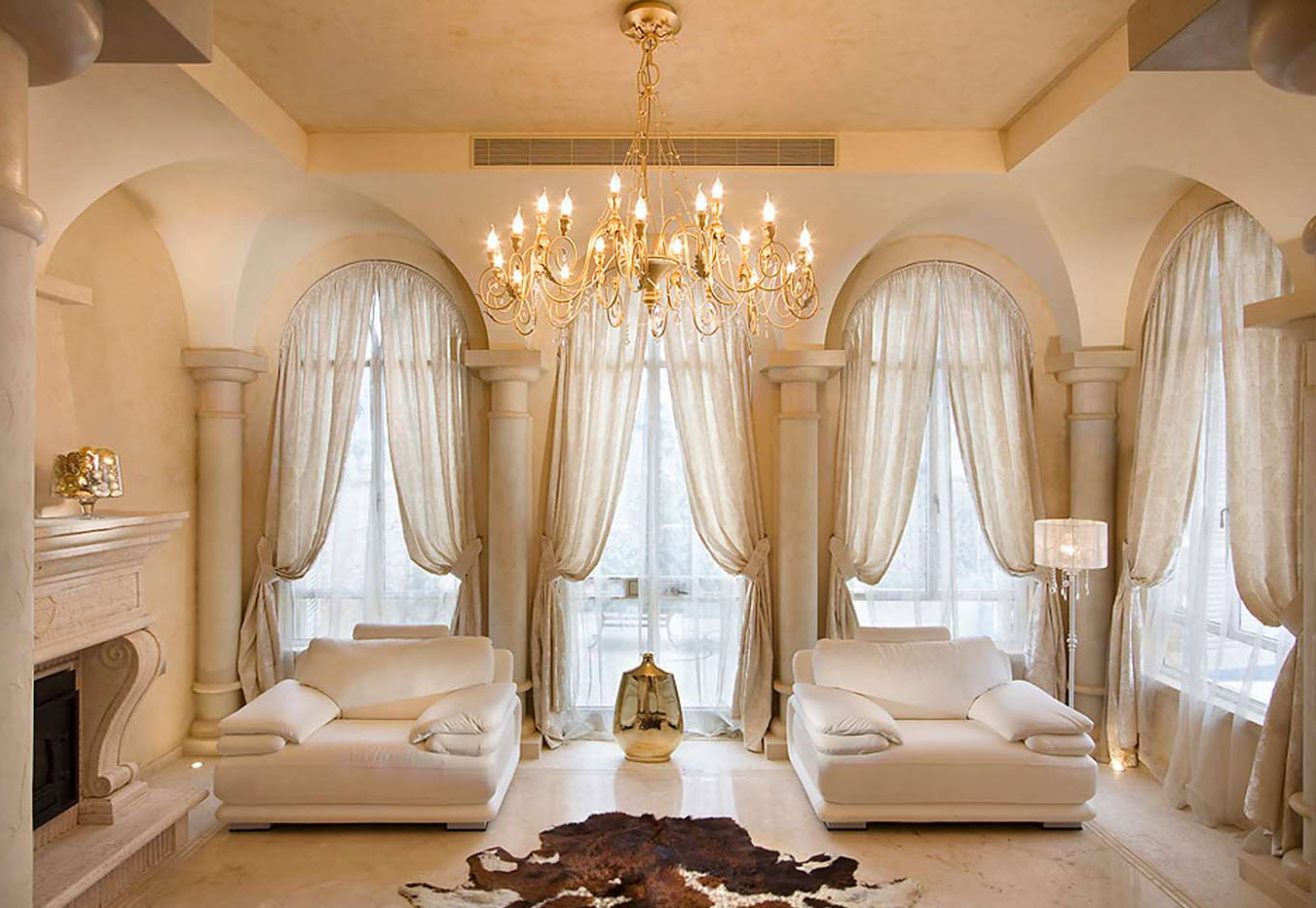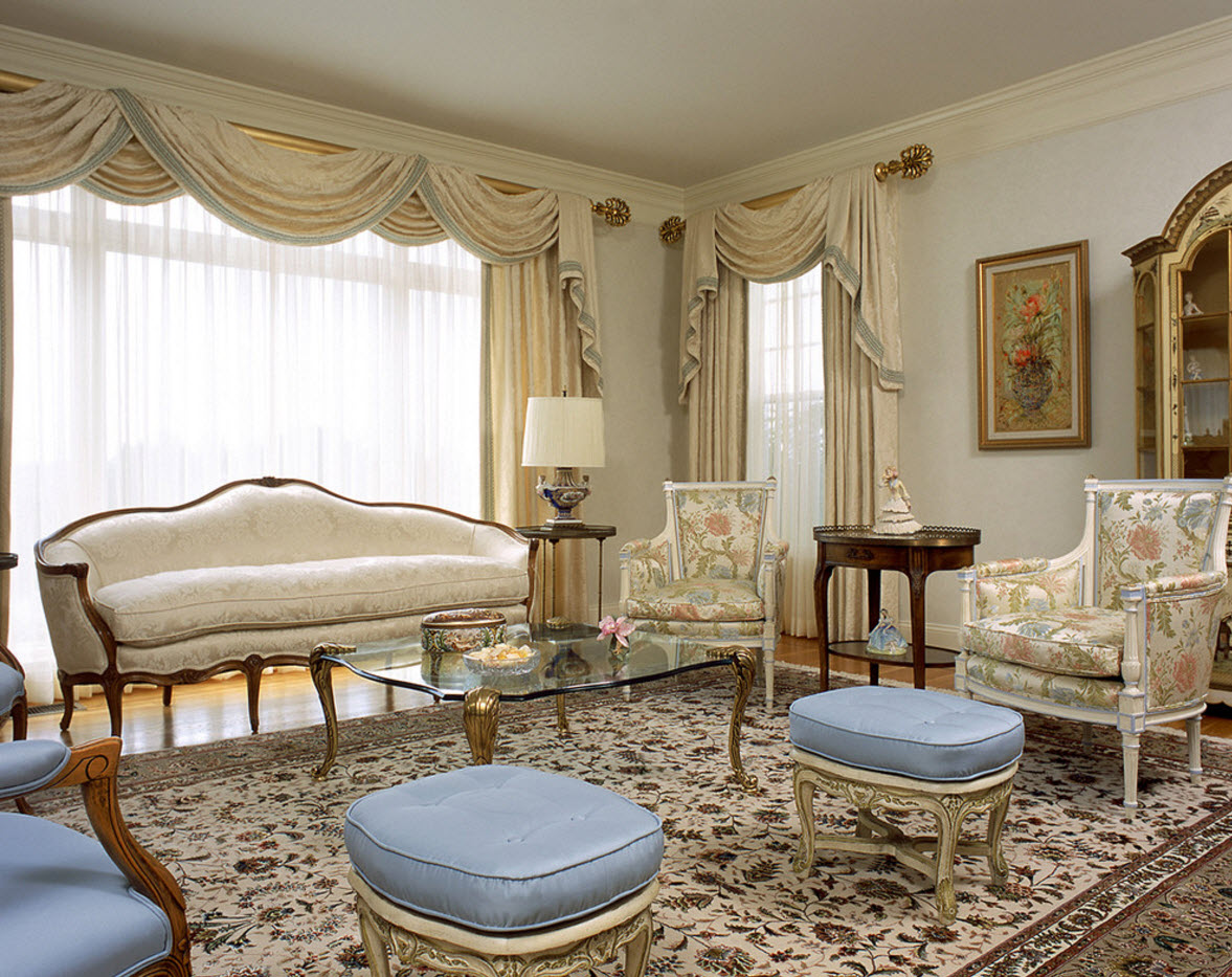 - Classique Pour le style classique, les couleurs blanc, crème, beige conviennent bien. Ils peuvent être combinés avec de lourds rideaux en velours, en soie et une bande avec des glands. Le dessus est souvent décoré de lambrequins. Il est permis d'utiliser des motifs brodés de broderie.