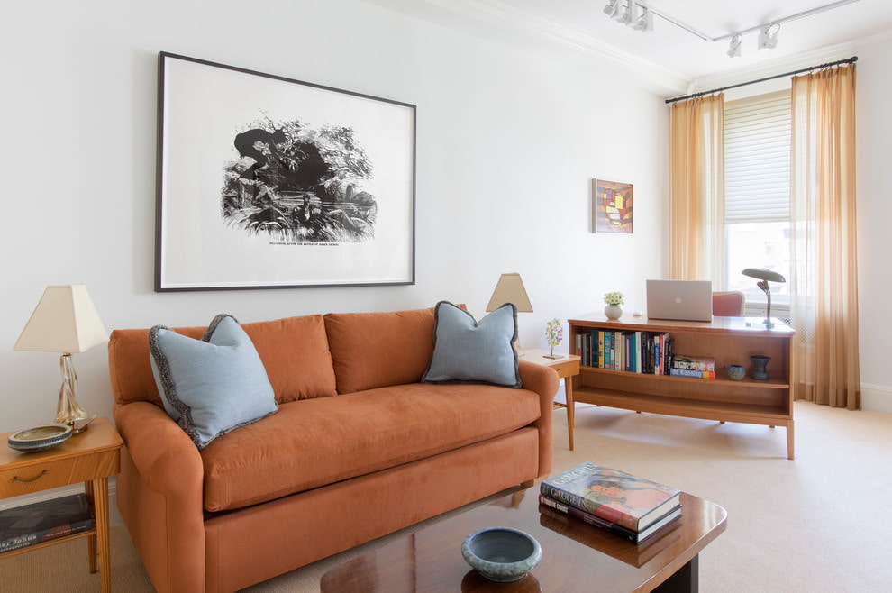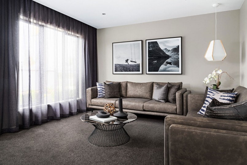 Tulle marron sur la fenêtre du salon avec un canapé de la même couleur