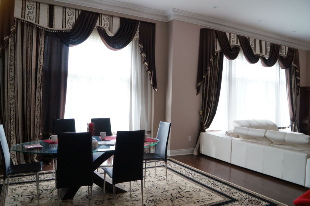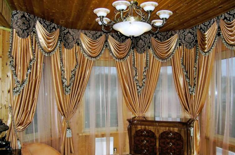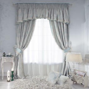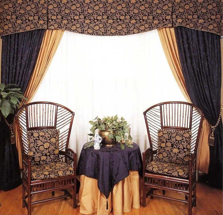 Les rideaux faits de tissus épais et lourds en combinaison avec des lambrequins durs ou mixtes sont mieux utilisés dans les pièces ensoleillées et bien éclairées.