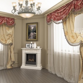 Pour une magnifique salle de grandes tailles, pour ajouter du luxe, il est recommandé d'utiliser des éléments décoratifs tels que des cravates et des volants. Dans les salles décorées dans des tons clairs, des lambrequins doux sont utilisés. Pour les petites pièces, les modèles avec une base dense qui remplit la fonction d'une large corniche sont les plus appropriés.