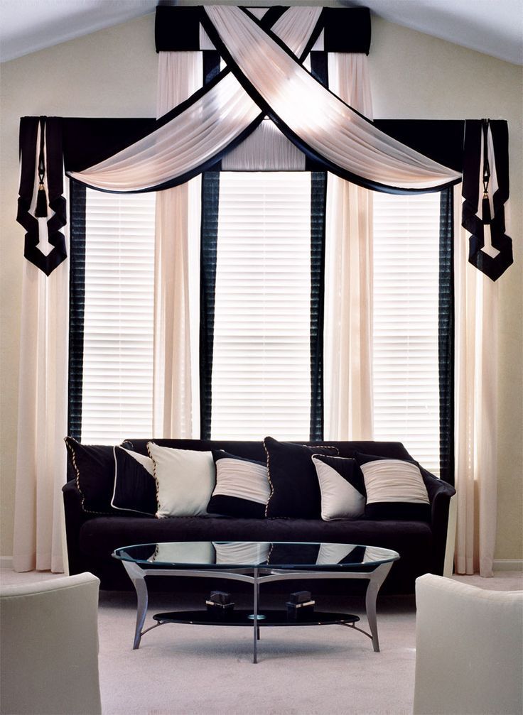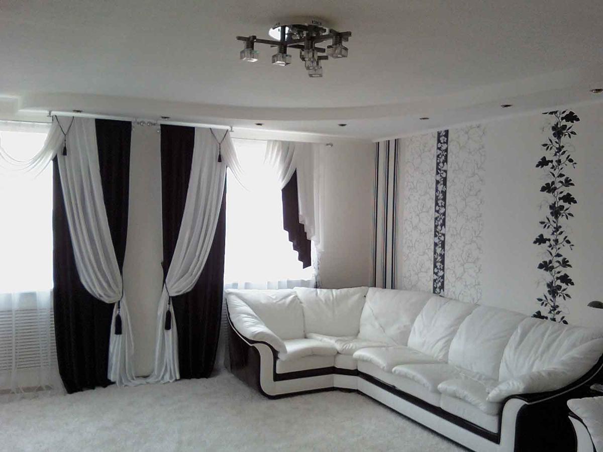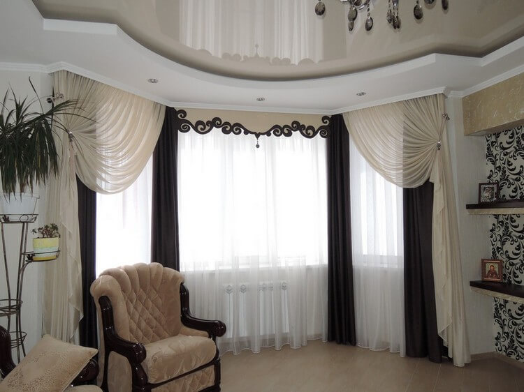 Cependant, assez souvent, des tissus aux couleurs radicalement différentes sont choisis. Par exemple, une version noir et blanc. Dans de tels cas, il est très important de consulter le concepteur, afin que plus tard, il ne s'avère pas que le lambrequin soit juste un point lumineux qui ne rentre pas dans l'intérieur global de la salle.