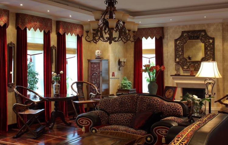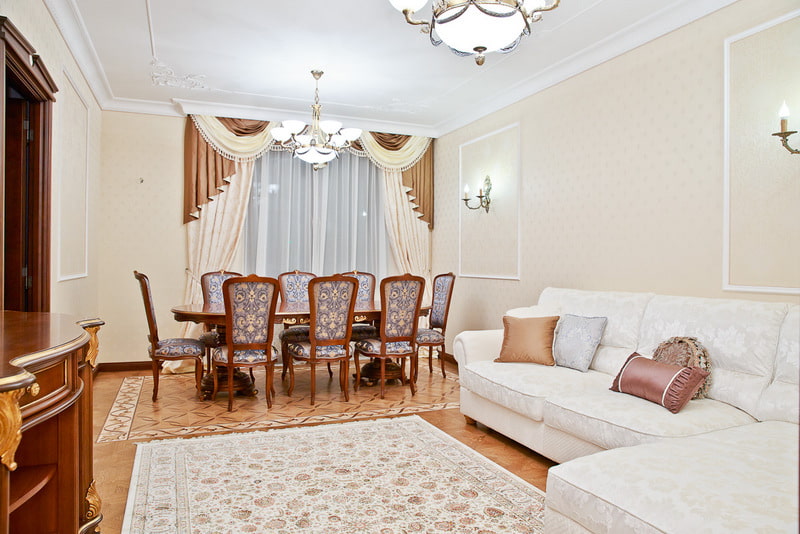 Tissus coûteux, rideaux à plis épais - une solution appropriée pour l'intérieur de la salle dans le style baroque
