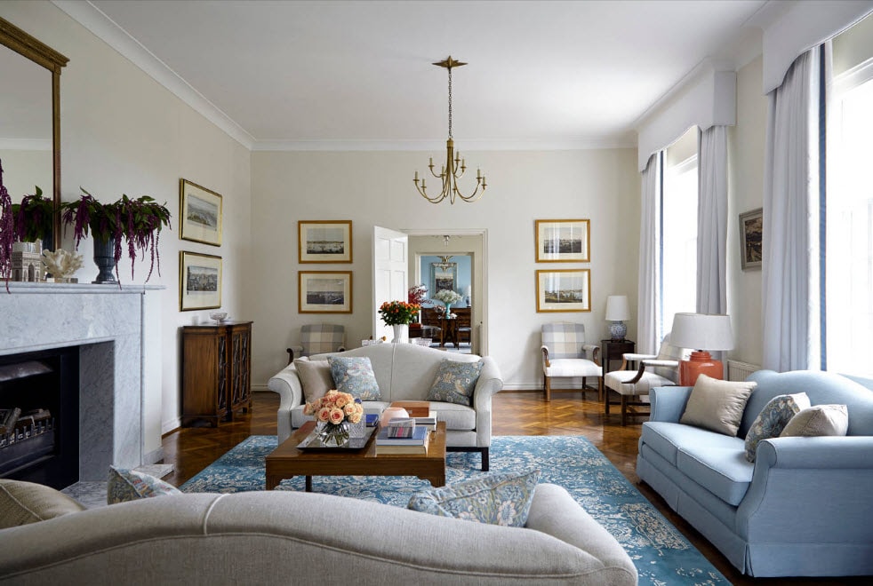 De longs rideaux à rayures verticales soulèvent visuellement le plafond du hall