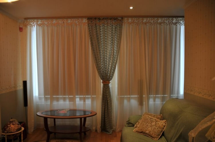 La combinaison d'un lambrequin en matériau dense avec un rideau translucide est l'une des solutions les plus courantes pour une pièce ou une chambre