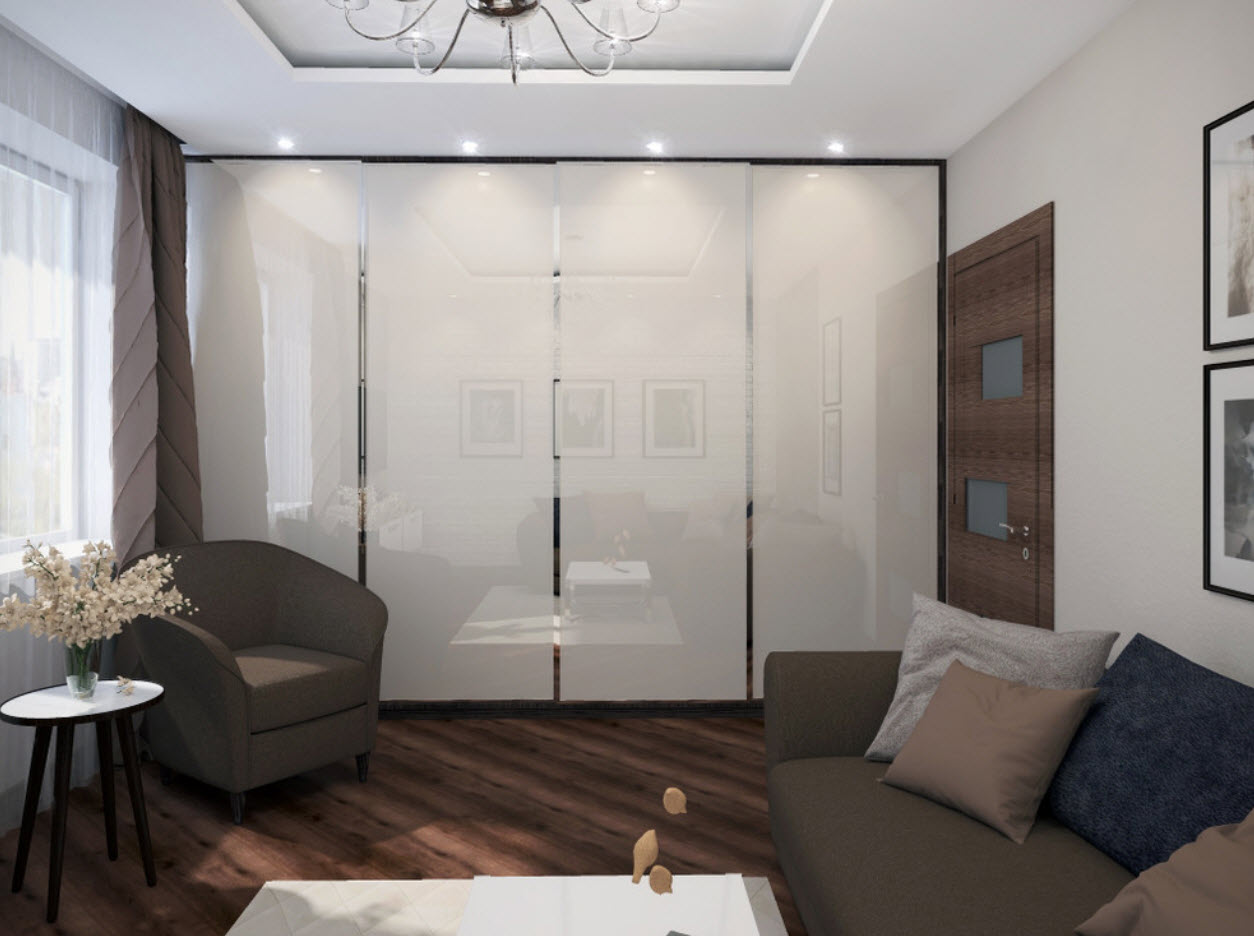 Quant aux meubles - ça ne devrait pas être grand-chose.La préférence devrait être accordée aux transformateurs de meubles de petite taille capables de reconstruire optiquement et d'agrandir l'espace. Il doit être situé dans le salon sans entrave, ne pas obstruer les passages vers les pièces voisines et l'accès à la fenêtre.