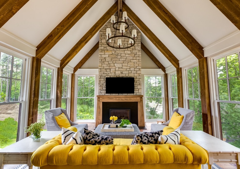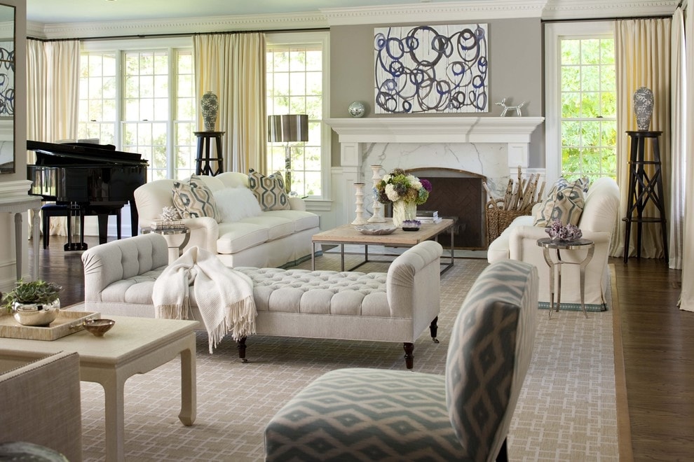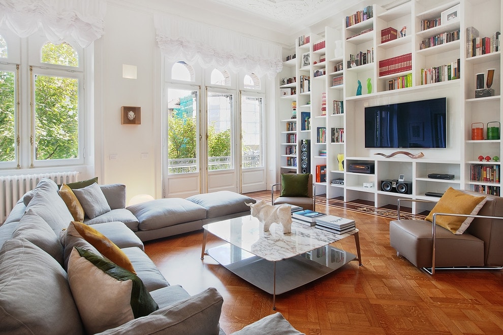 Une telle pièce peut être facilement divisée en zones nécessaires, selon différentes fonctionnalités. Fondamentalement, le salon est divisé en une zone avec une télévision et une zone avec une cheminée. Dans la zone de télévision, vous pouvez organiser des films en famille, des réunions avec des amis, jouer à des jeux de société amusants.