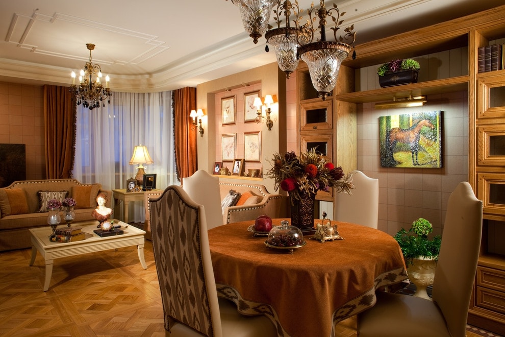 Ce style est idéal pour souligner son propre statut et sa noblesse. Il se distingue par un luxe et une sévérité particuliers dans les éléments de l'intérieur. Les meubles sont nécessairement en bois sculpté, avec des détails dorés, avec des inserts forgés. Souvent utilisé des meubles anciens et des rideaux occultants massifs. Regardez l'intérieur du salon populaire dans une photo classique des appartements.