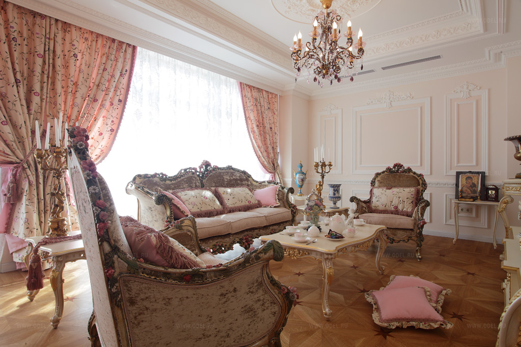 La règle de base est d'ajouter généreusement des dorures, des tons pastel, blancs. Couleurs bleues, rouges et vertes appropriées - tout dépend des préférences gustatives du propriétaire. Idéal en baroque - ivoire, saphir, émeraude, framboise, riche bourgogne.
