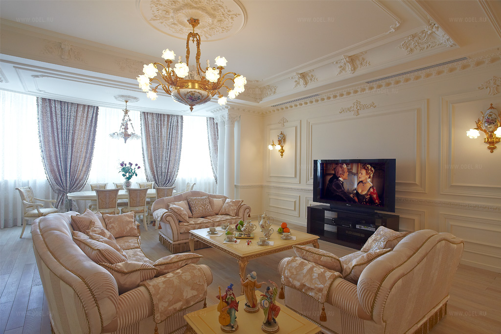 - Beaucoup d'espace libre sont les subtilités de la direction. La zone doit être grande: halls, pièces d'au moins 90 à 100 mètres carrés. Bien sûr, il n'est pas facile de trouver un si grand appartement, il faut donc créer la beauté avec ce qui est;