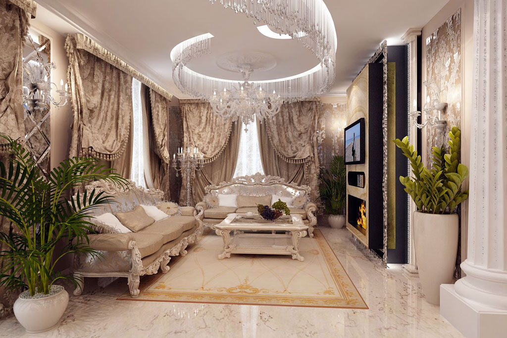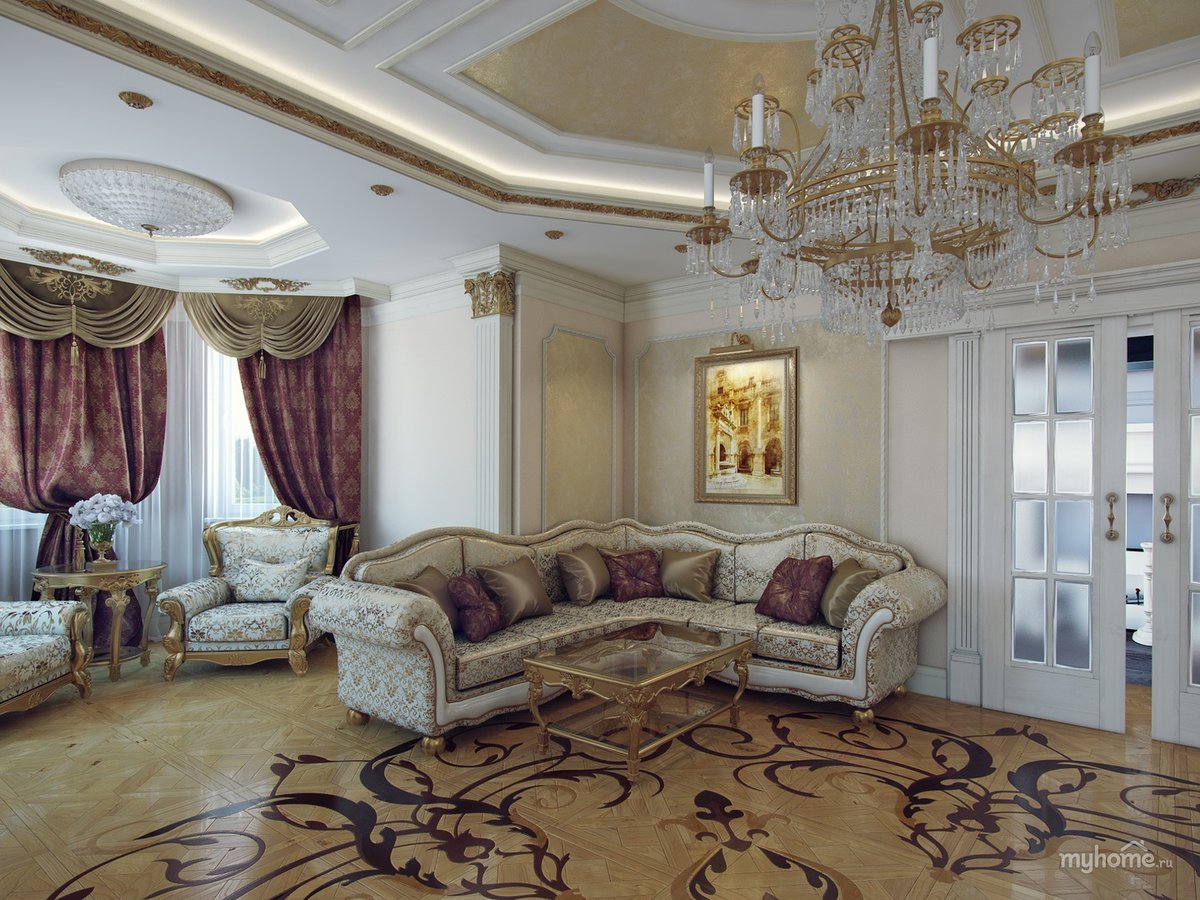 Les meubles doivent être fabriqués sur commande, la sculpture et les tissus d'ameublement coûteux, les jambes pliées ornées dorées et les accoudoirs doivent y être présents. Si vous êtes intéressé par ce à quoi ressemble un salon dans un style baroque exquis, consultez les photos sur des sites de créateurs. Si vous avez une petite pièce, ce style ne vous conviendra pas. Chaque détail est volumineux, grand: figurines, sculptures, peintures.