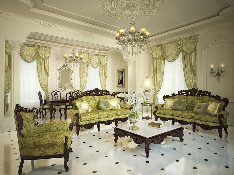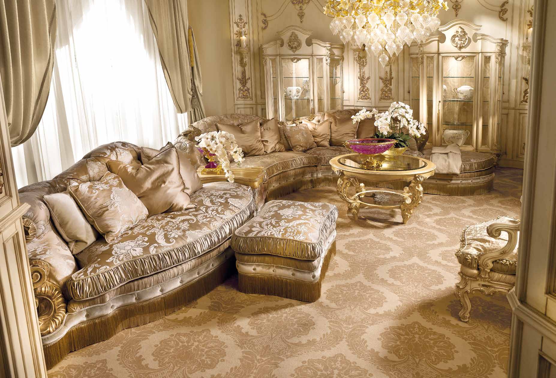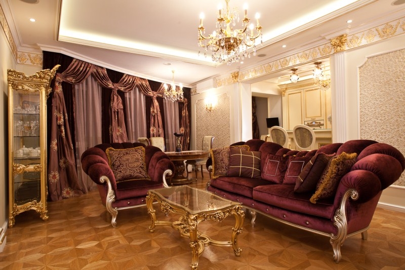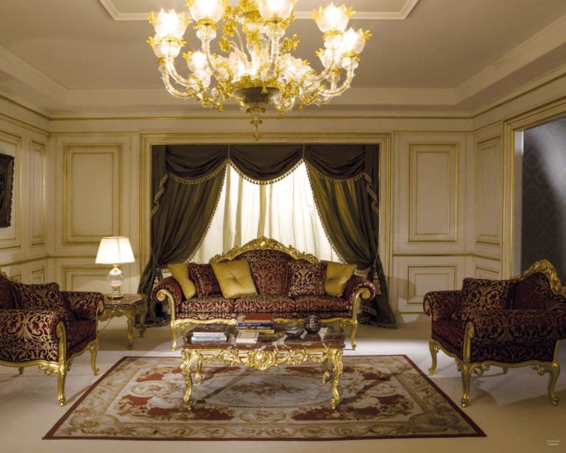 Le mobilier est toujours au centre de l'attention des clients. Dans ce sens, il remplit non seulement sa fonction directe et son objectif - il est le principal attribut des regards enthousiastes. Les canapés et fauteuils moelleux doivent être recouverts d'un revêtement en velours ou en soie coûteux, qui représente un motif floral traditionnel avec de la dorure. Le dos des canapés est légèrement allongé, tout comme les pieds. Franges, brosses agissent comme un décor. Assurez-vous d'avoir beaucoup d'oreillers de différentes formes et tissus. la base du cadre du meuble est le bois naturel ou son imitation de haute qualité. Option plus économique - panneaux de particules durables.