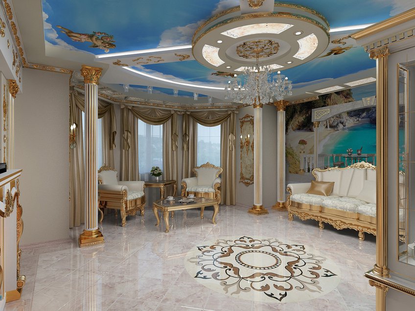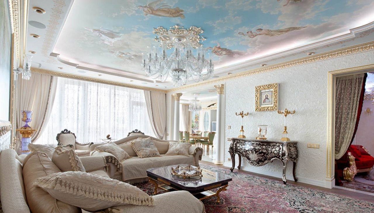Pour transmettre la couleur de l'époque, diluez l'intérieur avec des fresques. Si vous ne souhaitez pas utiliser de peintures murales, vous pouvez utiliser des impressions sur la toile.Le ton idéal du plafond est blanc comme neige, sur lequel la peinture dorée semble favorablement et les baies vitrées, les arcs sont combinés.