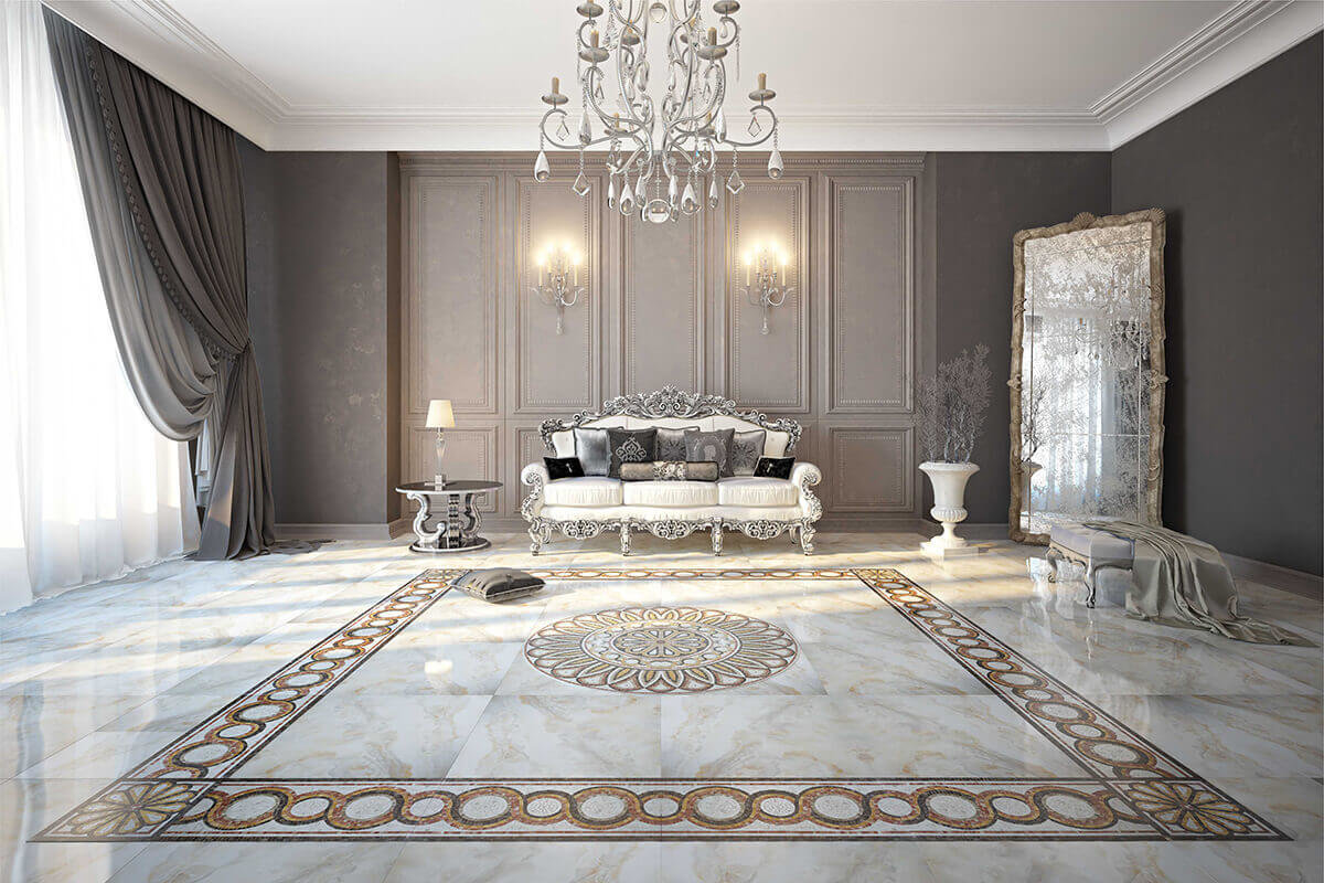 Dans le style baroque, il n'y a pas de place pour la dissonance: le sol doit être en harmonie avec le reste des détails. Le parquet traditionnel est en céramique, en bois naturel (parquet). La pierre naturelle est magnifique. Sur une telle surface, un tapis en tissu non pelucheux doit être étalé - la pierre est froide et il n'est pas recommandé d'installer un chauffage au sol.