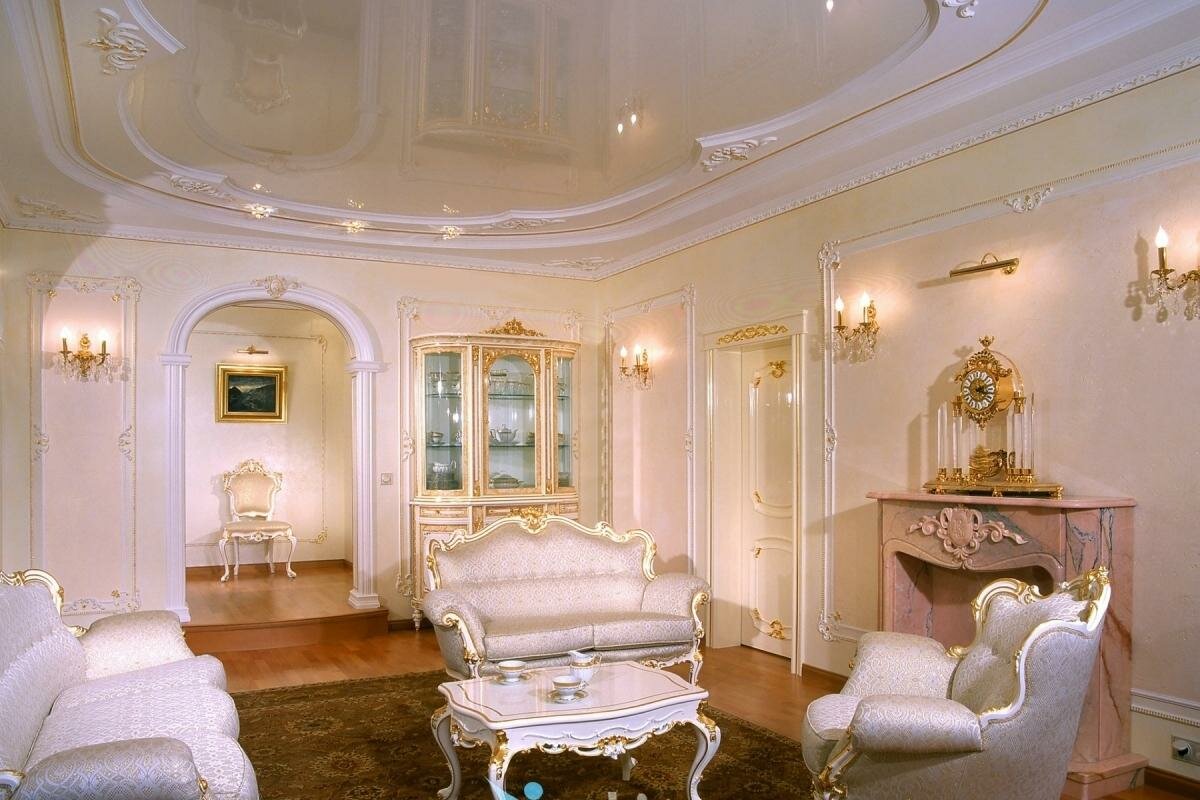 Le baroque se caractérise par une transition en douceur du mur au plafond. Il n'y a pas de place pour des limites claires, comme dans un loft ou une haute technologie. Tous les joints au plafond sont décorés de figures décoratives en stuc ou en plâtre avec dorure. La forme de la surface du plafond est parfaitement plate ou voûtée - elle a l'air originale et inhabituelle. Cette dernière forme donne une atmosphère de solennité.