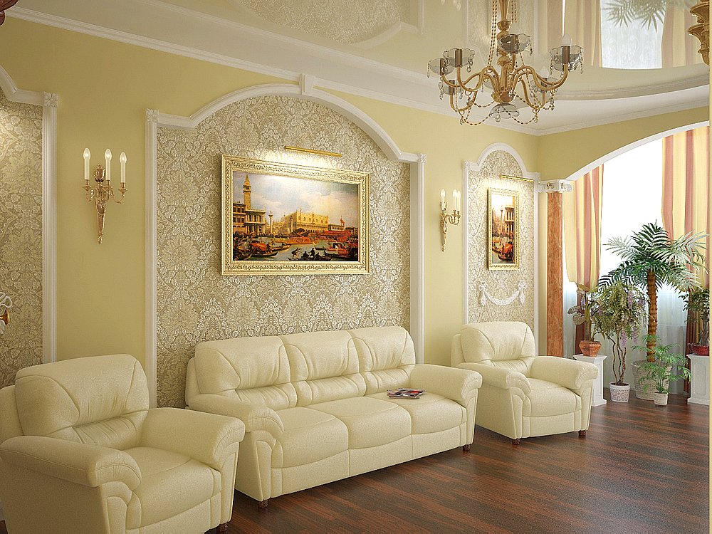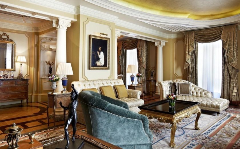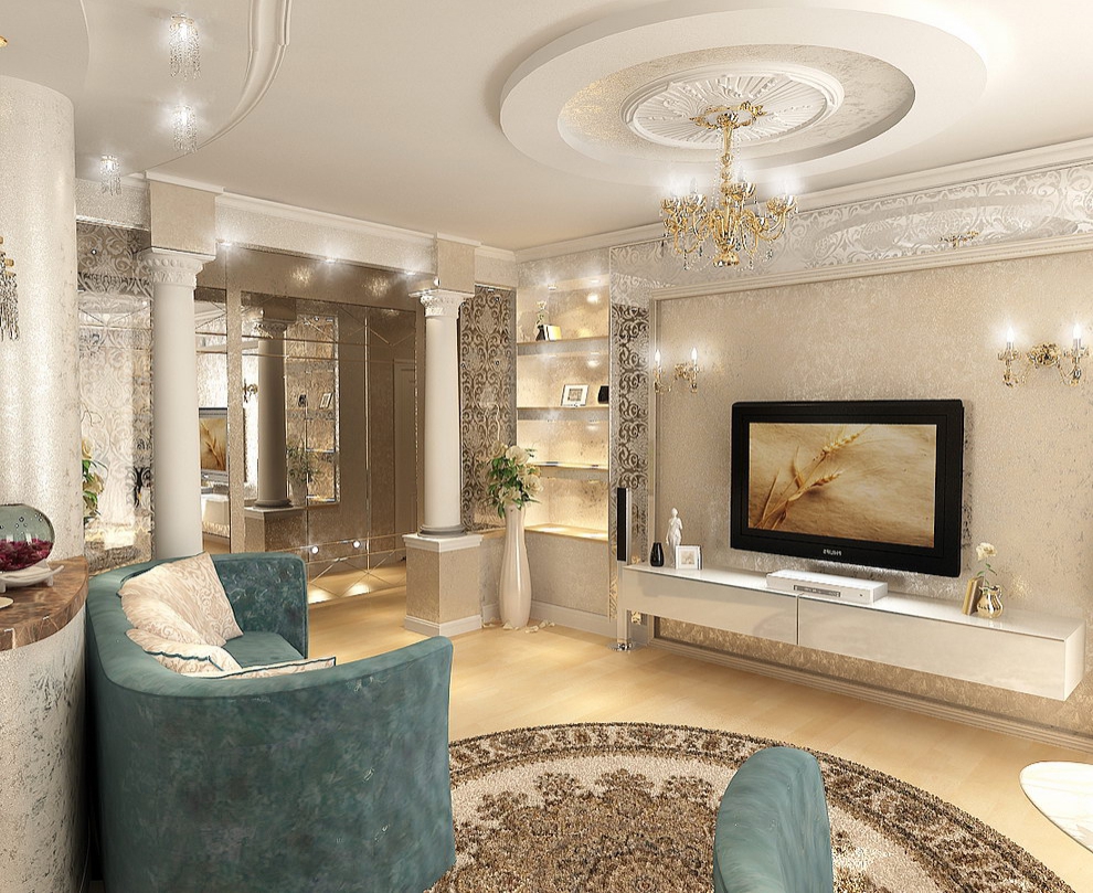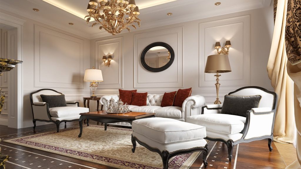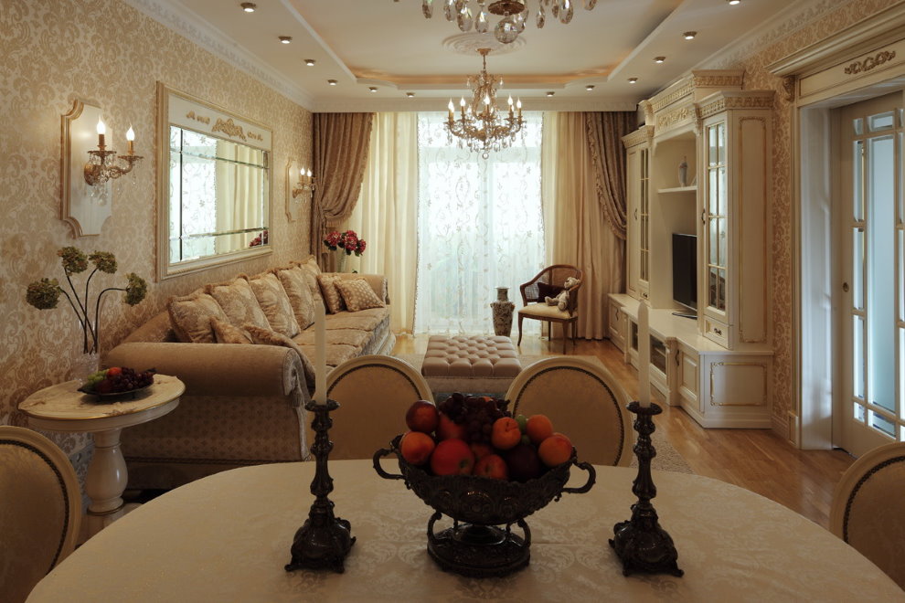 Dans ce style, cette pièce aura l'air parfaite, car sa mise en œuvre nécessite un grand espace, qui est rempli d'une décoration exquise et d'un mobilier chic. Ce style a été adopté à la cour royale et devrait être répété lorsqu'il est appliqué dans le salon, avec des éléments de luxe et de richesse.