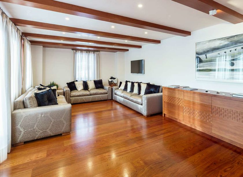 Un exemple de zonage d'un salon à l'aide de feuilles tendues placées entre des poutres en placoplâtre