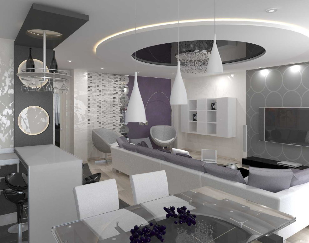 Vous pouvez également faire des accents légers et décoratifs en utilisant un plafond à plusieurs étages. Salon de 25 mètres carrés. m la conception de la photo sera visuellement séparée de la cuisine, si vous utilisez un plafond tendu de deux couleurs différentes pour faire une séparation entre elles. Vous pouvez également faire un plafond en surplomb dans la cuisine à l'aide de cloisons sèches, mais dans le hall, ne le changez pas. Ensuite, les plafonds du salon sembleront plus élevés et visuellement, il y aura une division en deux zones différentes.