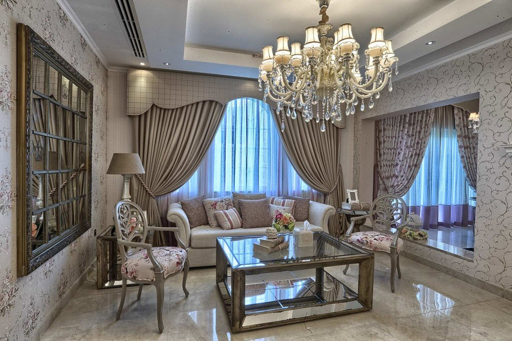 Si vous décidez d'équiper le salon dans le sens classique, il est recommandé de respecter un schéma de couleurs sobre. Les tons pastel sont les bienvenus en combinaison avec des tons saturés plus profonds. Il n'est pas recommandé d'utiliser des couleurs vives et colorées.