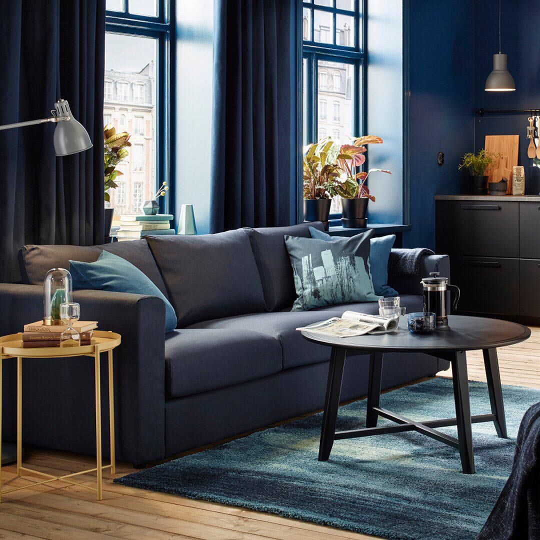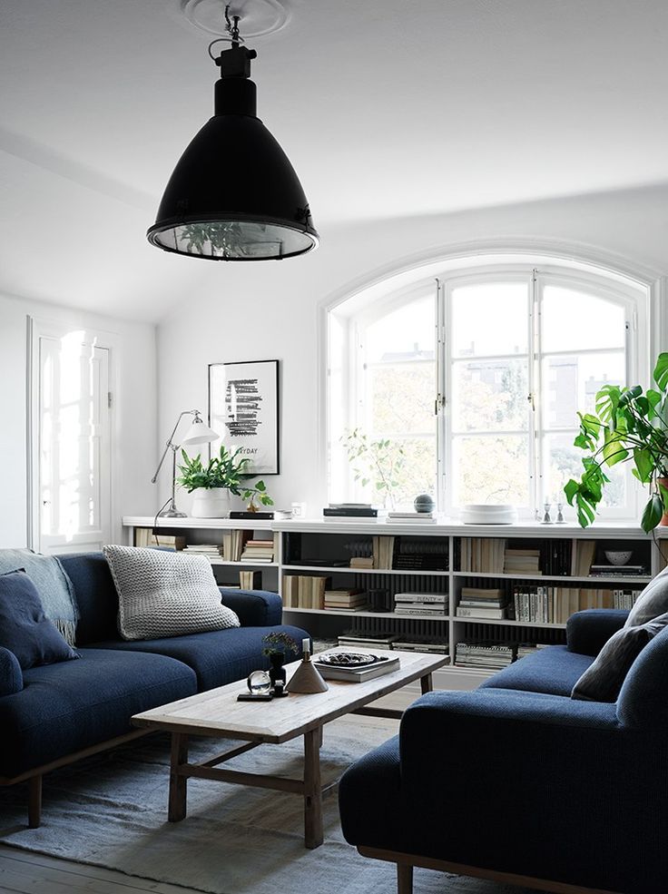 Canapé bleu foncé comme un accent lumineux dans le salon de style scandinave
