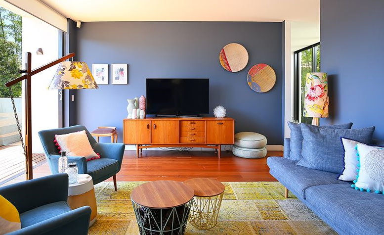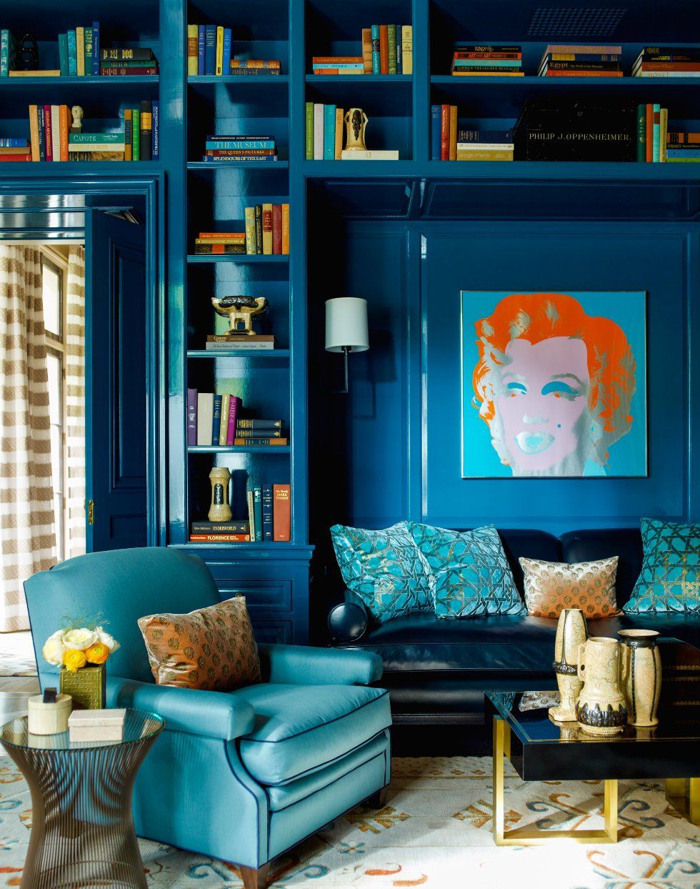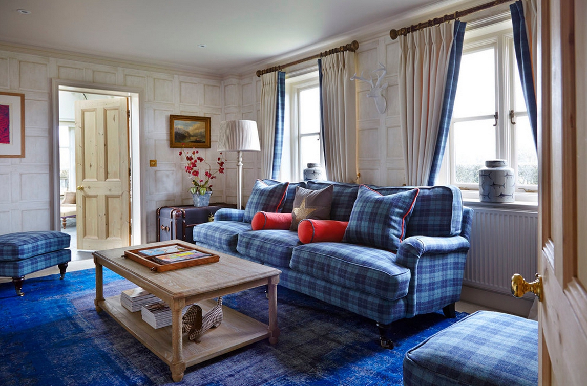 - La combinaison du bleu avec d'autres meubles dans le salon