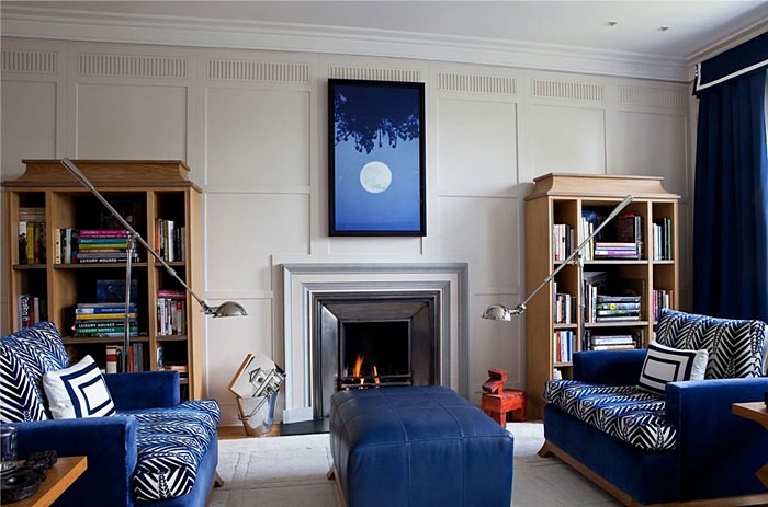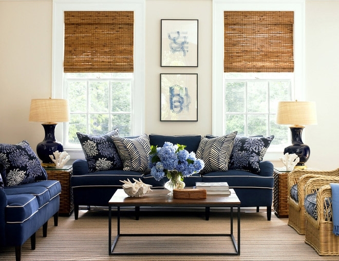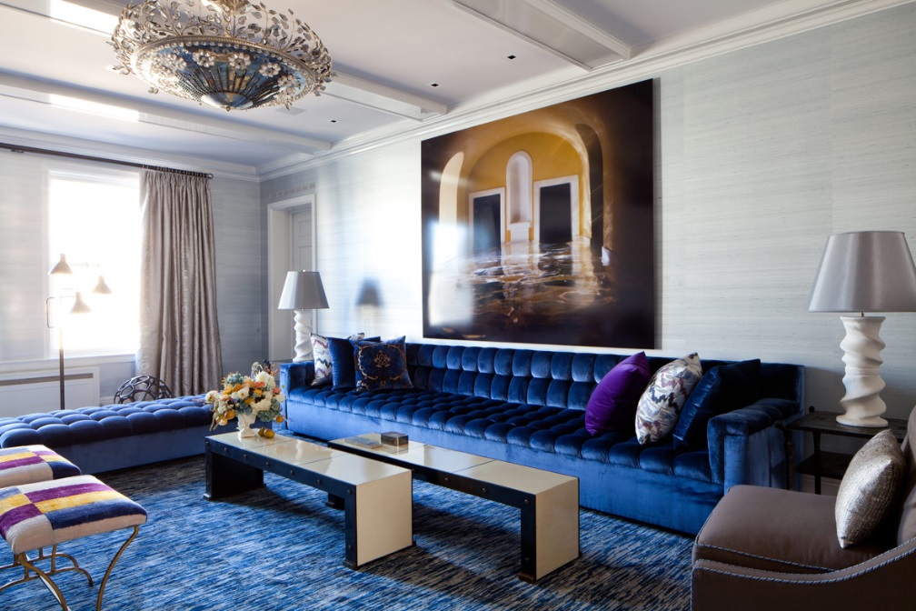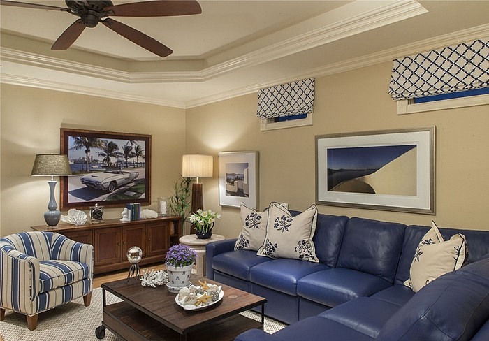 Un grand choix sera la couleur marine. Mais ils devraient mettre en évidence une chose - un mur, un sol, des meubles ou un plafond. Les accessoires sont assortis pour correspondre. Si le salon a un canapé bleu, tout le reste devrait être de couleurs vives.