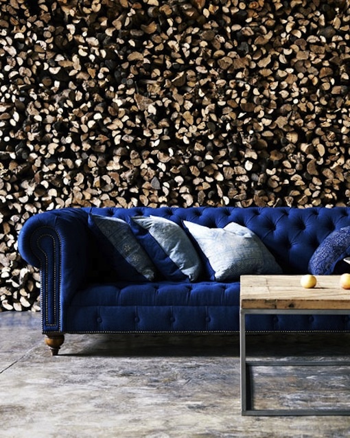 Les canapés bleus auront fière allure sur le fond des boiseries en bois brun
