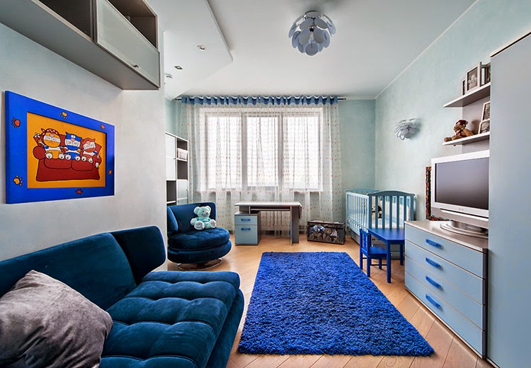 - Par fonctions - pour séparer les meubles pour la détente et le travail, tout en utilisant toujours le même matériau et la même couleur. Une excellente option serait le bleu.
