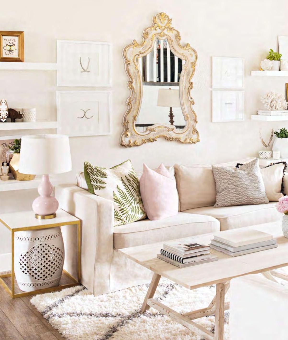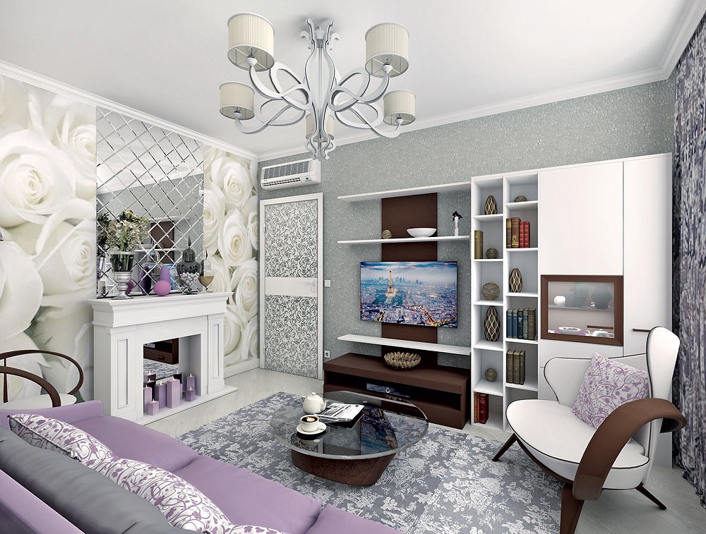 Un jeu de couleurs peut créer de petits détails. Dans le salon aux couleurs pastel, des motifs de papier peint blanc sur les murs, des moulures en stuc blanc au plafond et des éléments de décoration sur les meubles conviendront.