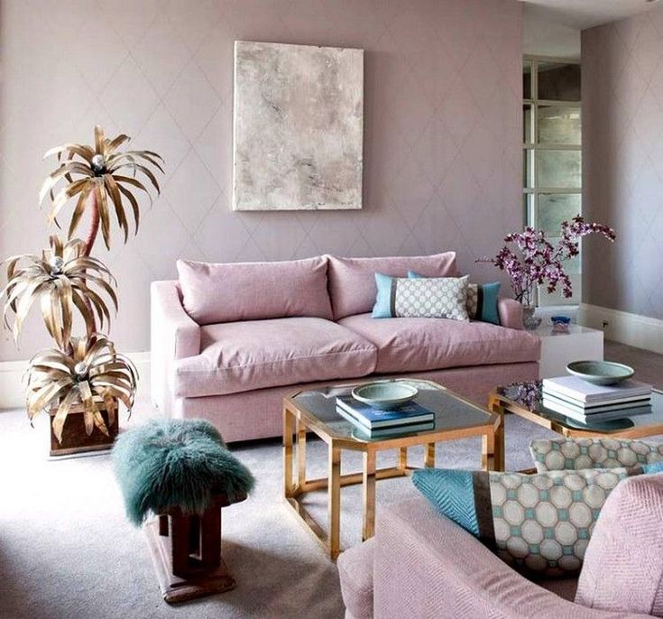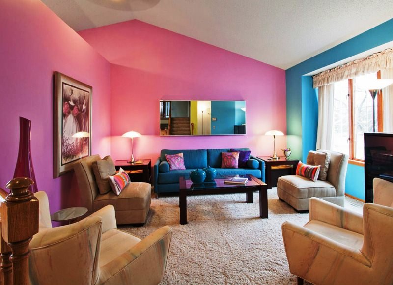 Une combinaison harmonieuse de rose et de bleu dans un salon de style mixte
