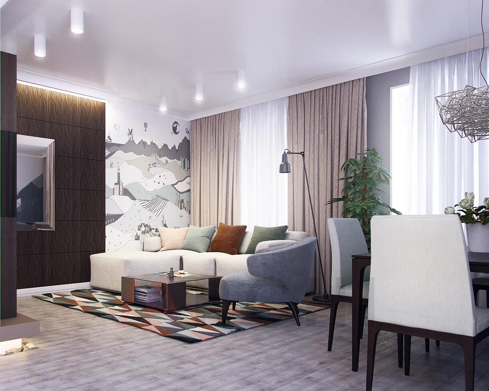 Le salon est la pièce où la vie bat son plein. Il est important que l'intérieur lui-même ne détourne pas trop l'attention. Autrement dit, il est important de maintenir l'harmonie et un juste milieu, en particulier dans le jeu de couleurs. Après tout, la palette de couleurs, y compris les murs, les rideaux et les meubles, est ce qui attire immédiatement le regard du visiteur et c'est ce que le propriétaire ressent chaque fois qu'il entre dans la maison.