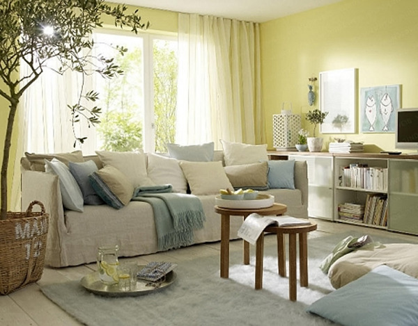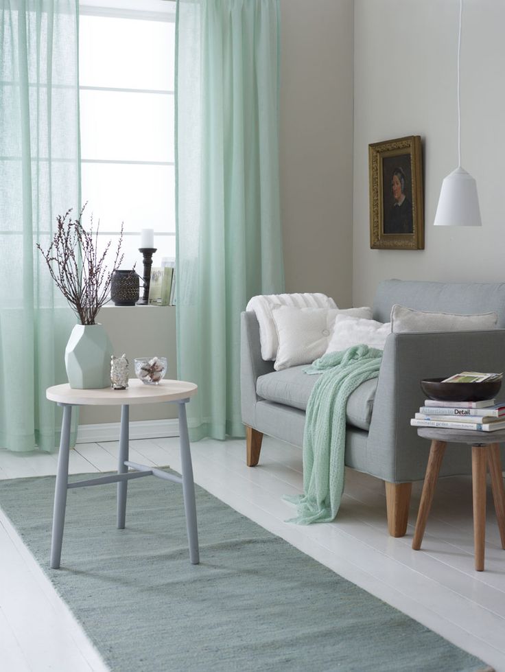 Il est important de choisir une couleur comme base. Il convient à la décoration des murs, des rideaux et des grands meubles. Les petits objets peuvent être de la même couleur, mais plus foncés ou plus clairs, ou peuvent être en contraste. Pour le salon aux couleurs pastel, les options contrastées ou les combinaisons de différents tons semblent bonnes. La première option donne le rythme et reste en forme. Le second se détend et surprend par ses débordements fluides, créant une belle félicité.