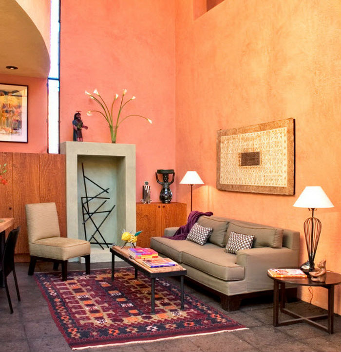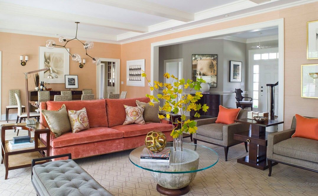 Le salon de couleur pêche aura l'air chaleureux et confortable. La pêche convient pour une grande salle ou pour un placement sur le côté nord. Dans le même temps, le jaune doit être manipulé avec beaucoup de prudence - dans certains cas, les objets qu'il contient peuvent sembler sales, ils peuvent commencer à gêner avec le temps.