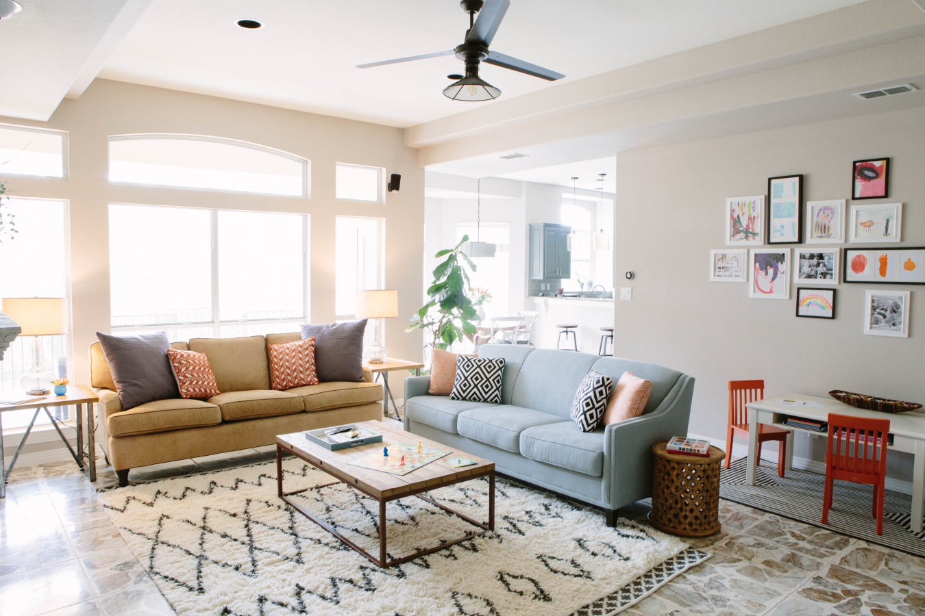 Grand salon peint dans des tons pastels contrastés