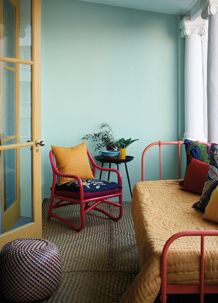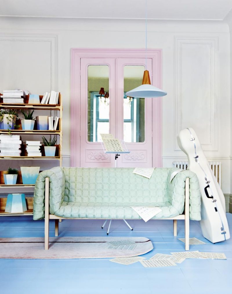 Les couleurs pastel créent une atmosphère de chambre et soulignent les contrastes créés par les éléments décoratifs.