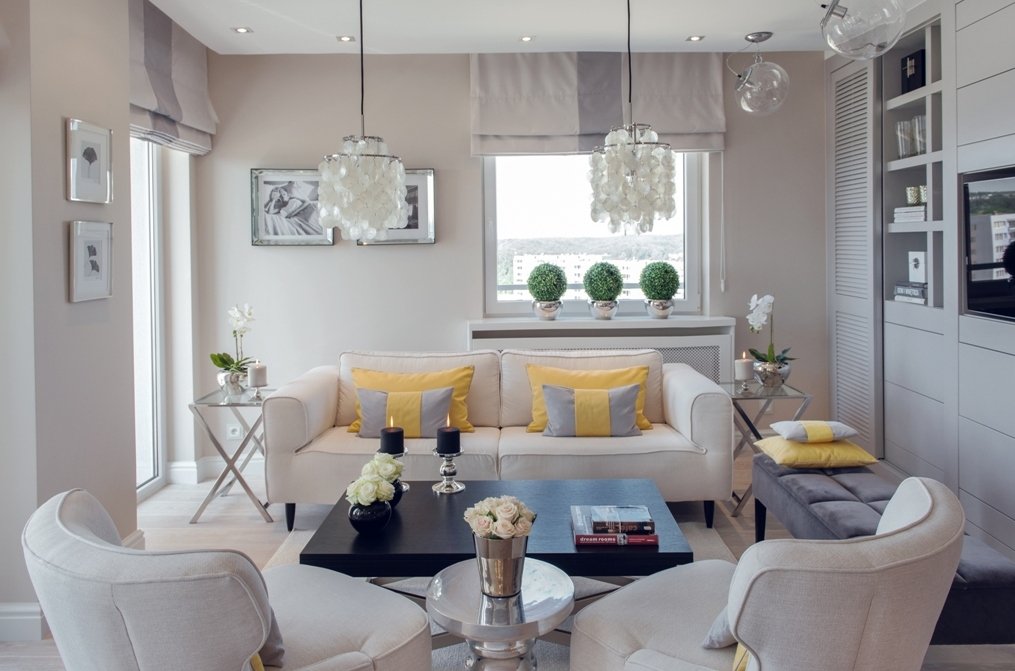 Le jaune est semblable au beige. Il aura fière allure dans un intérieur classique ou moderne. De plus, il peut être de différentes nuances - du citron délicat à la pêche. Le salon jaune crée un sentiment de bonheur et de joie. Le citron aura fière allure dans une petite pièce de Khrouchtchev ordinaire.