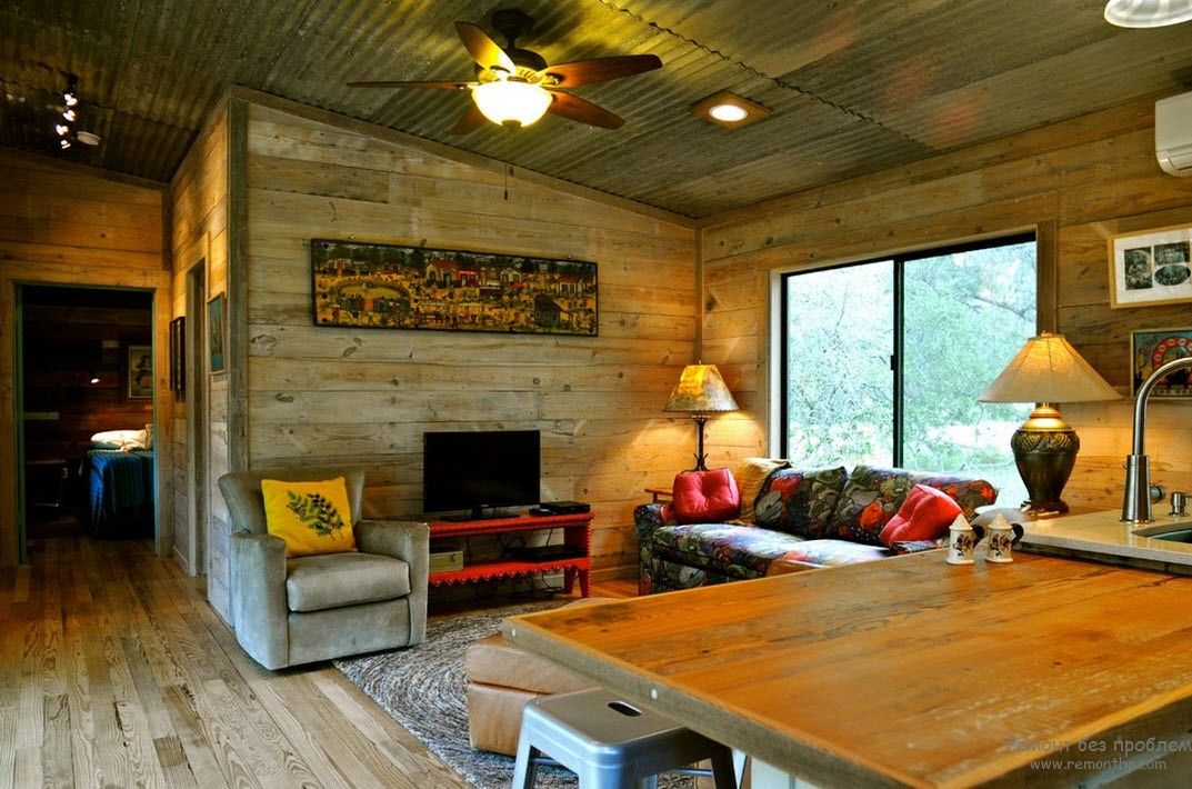 Par conséquent, toute la conception et toute la conception du salon de votre chalet doivent répondre aux exigences de base: détente, confort, détente. Il doit être léger, chaleureux, confortable, un peu festif, beau, insolite. Ici, vous ne vivez pas en permanence, donc le design inhabituel ne s'ennuiera pas, mais au contraire, vous le manquerez les jours ouvrables.