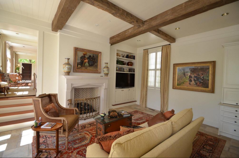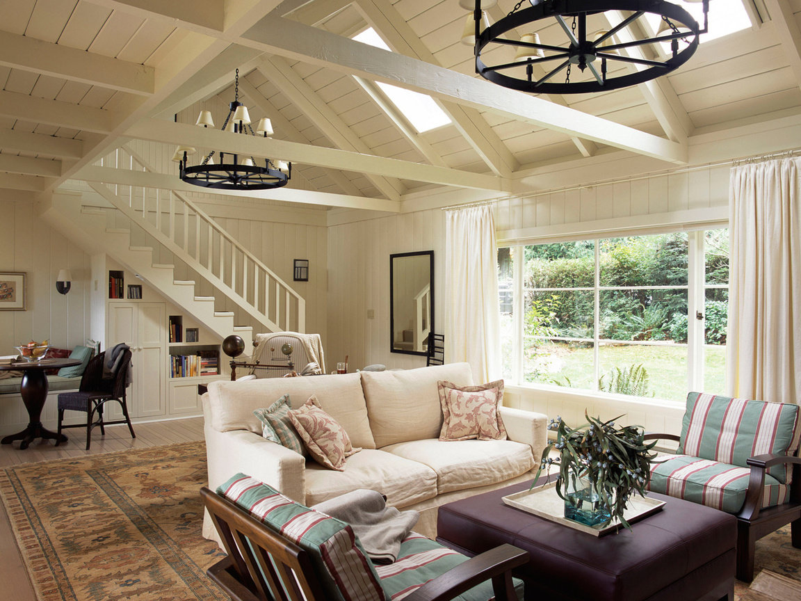 Vous êtes particulièrement chanceux si le plafond a une forme triangulaire, répétant les courbures du toit de la maison. Vous pouvez donc créer un beau design: utilisez des poutres en bois pour créer du volume, et ainsi obtenir un effet inhabituel. Soit dit en passant, les poutres en bois et les plafonds dans leur ensemble ont fière allure dans le salon à la campagne: de simples poutres massives qui remplissent une fonction décorative. Il peut s'agir d'une ou deux poutres sur tout le plafond, juste en dessous de son niveau. Sur ces poutres, vous pouvez fixer le décor, mettre des plantes grimpantes qui tombent, accrocher quelque chose. Très beau!