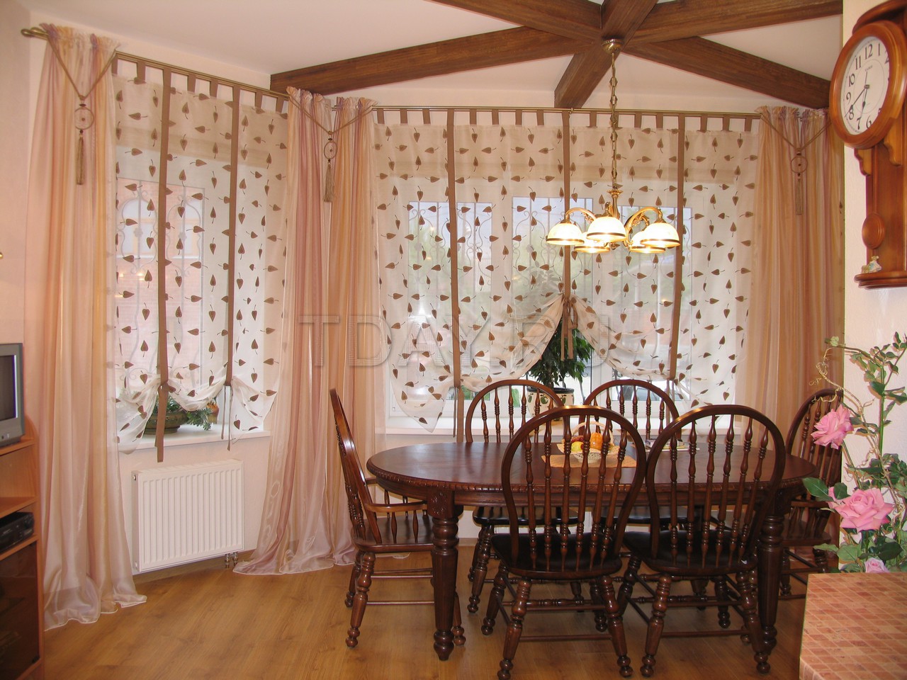 Si le grand salon du pays sert à rassembler des invités et des rassemblements avec eux, vous devrez en utiliser une partie comme salle à manger. Ici, vous aurez besoin d'une table à manger, de chaises ou de tabourets, d'un éclairage adéquat.