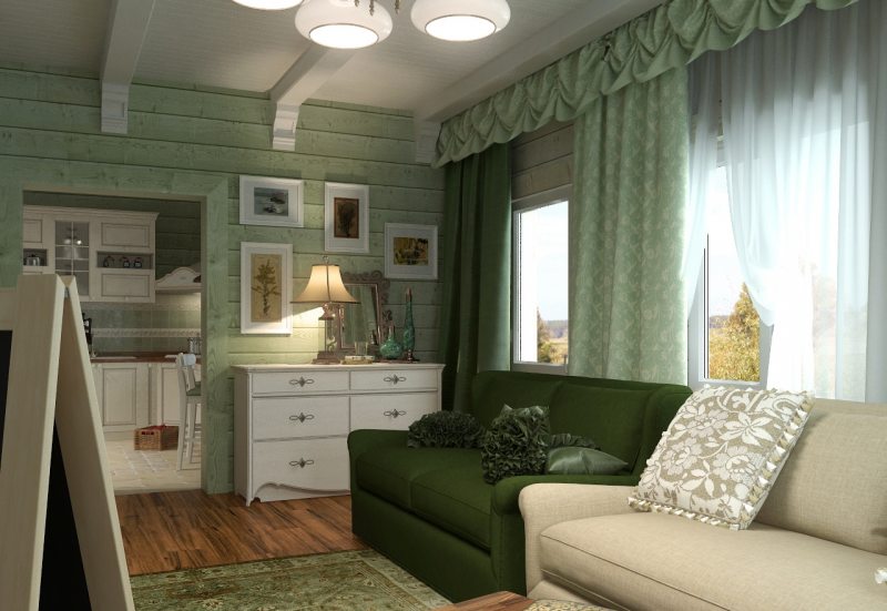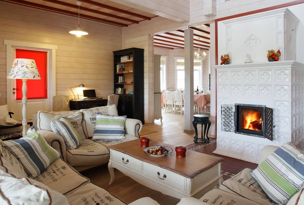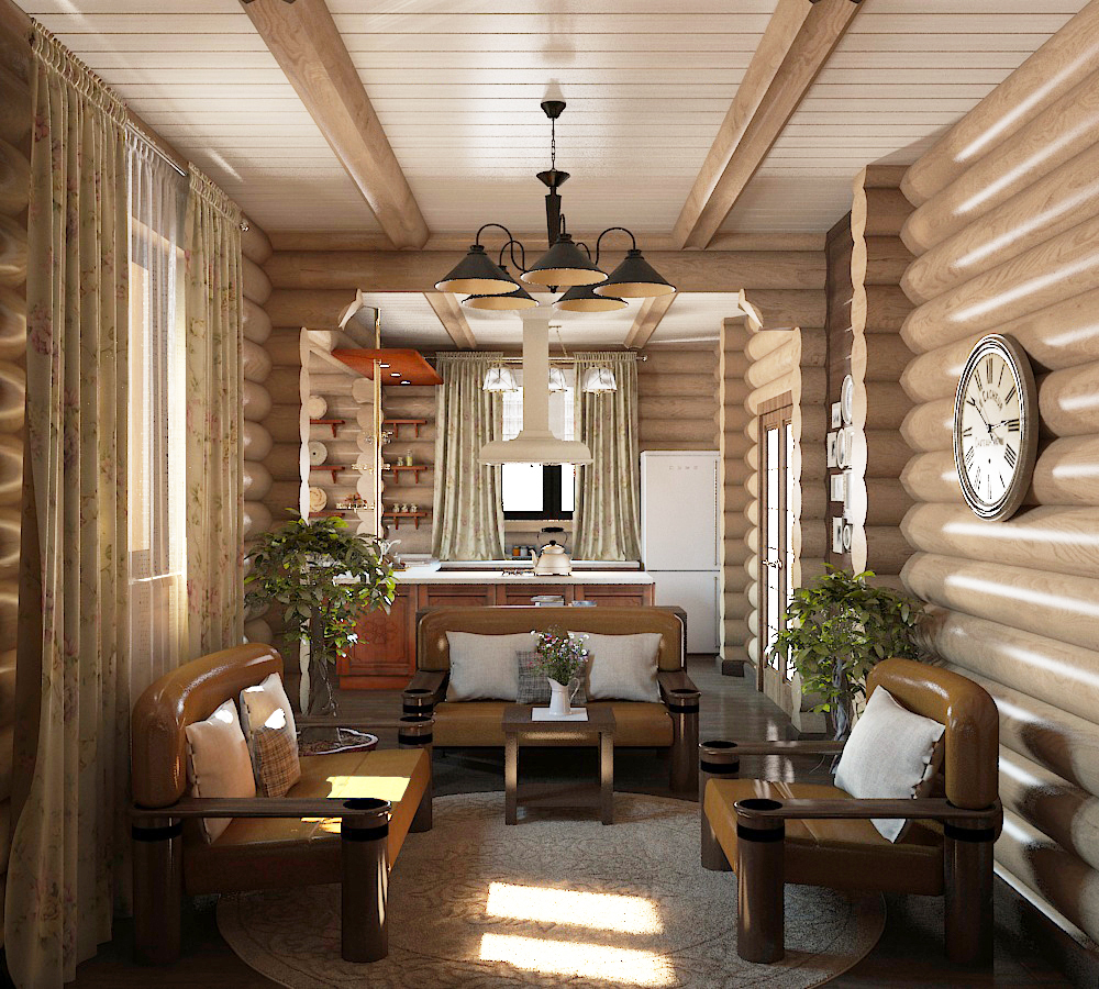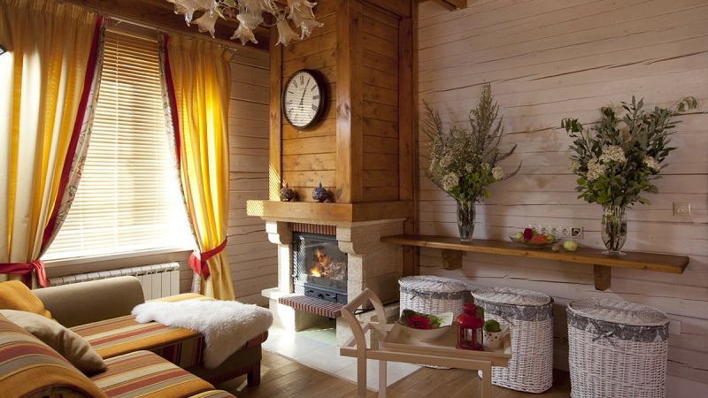 Décidez de ce qui devrait y être et débarrassez-vous de tout ce qui est superflu.Laissez, par exemple, une cheminée miniature, un fauteuil ou un petit canapé (que vous pouvez plier ou coin), et une petite table basse. Une grande table n'est pas nécessaire ici, car vous pouvez déjeuner dans la cour ou dans la cuisine. Accrochez une vieille pendule à coucou et une photo avec une belle nature morte sur les murs, et laissez la décoration être en bois. Beaucoup de lumière, un tapis sous vos pieds - c'est tout!