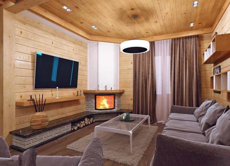 Ne rendez pas le salon à la campagne trop sombre. Au contraire, plus elle est lumineuse, plus vos vacances à la campagne seront confortables et agréables. Il est préférable de choisir une nuance de bois clair naturel et d'en "danser". La couleur et la texture du bois brun affectent positivement l'humeur et la psyché, et dans cette pièce il y aura toujours une sensation de détente et de confort.