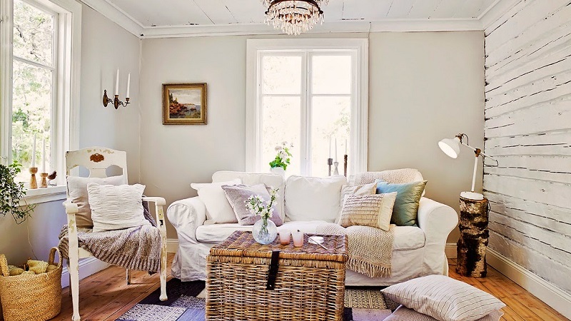 Une belle couverture ou des oreillers décoratifs doivent être placés sur le canapé et les rideaux doivent être des rideaux lumineux adaptés à l'intérieur. S'il y a beaucoup d'espace, prenez un grand décor: par exemple, un grand vase au sol. Et rappelez-vous: rien de plus!