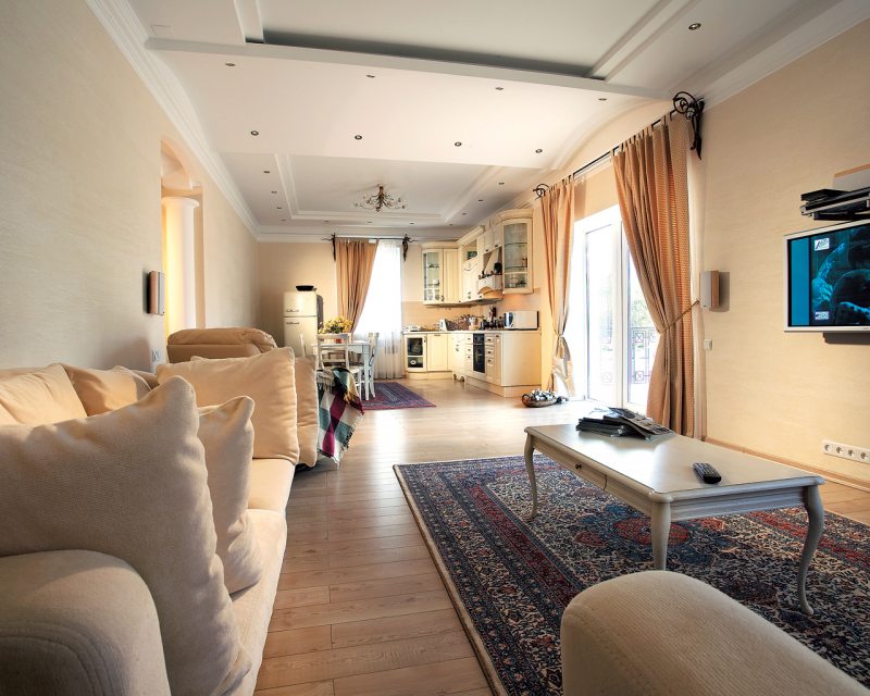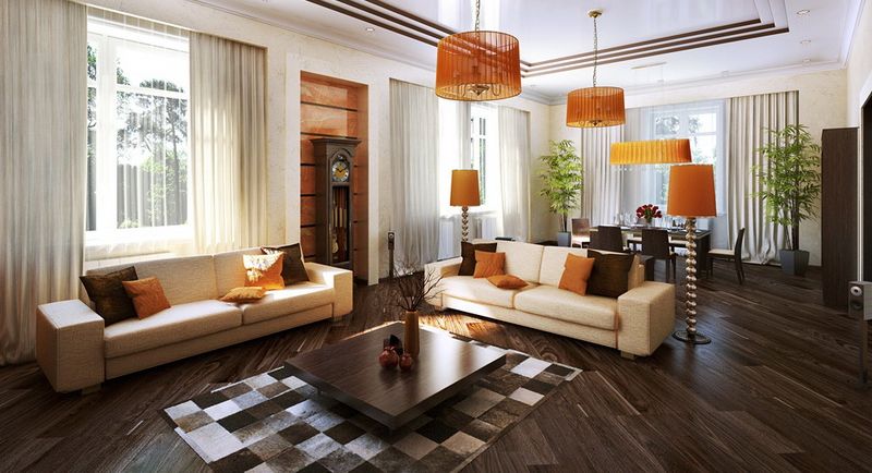 La salle est la pièce la plus visitée et la plus visible pour les étrangers. Il est évalué dans la première minute de haut en bas. Par conséquent, lors de la réparation, il est important de choisir le bon revêtement de sol, car contrairement aux articles d'intérieur, il ne fonctionnera pas pour le déplacer ou le changer rapidement.