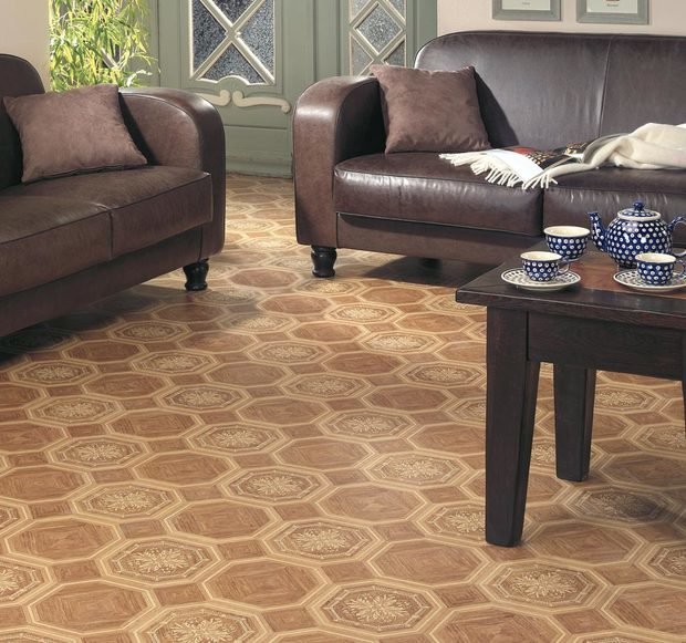 Dans les intérieurs traditionnels, le linoléum est généralement posé sous du bois clair ou foncé.