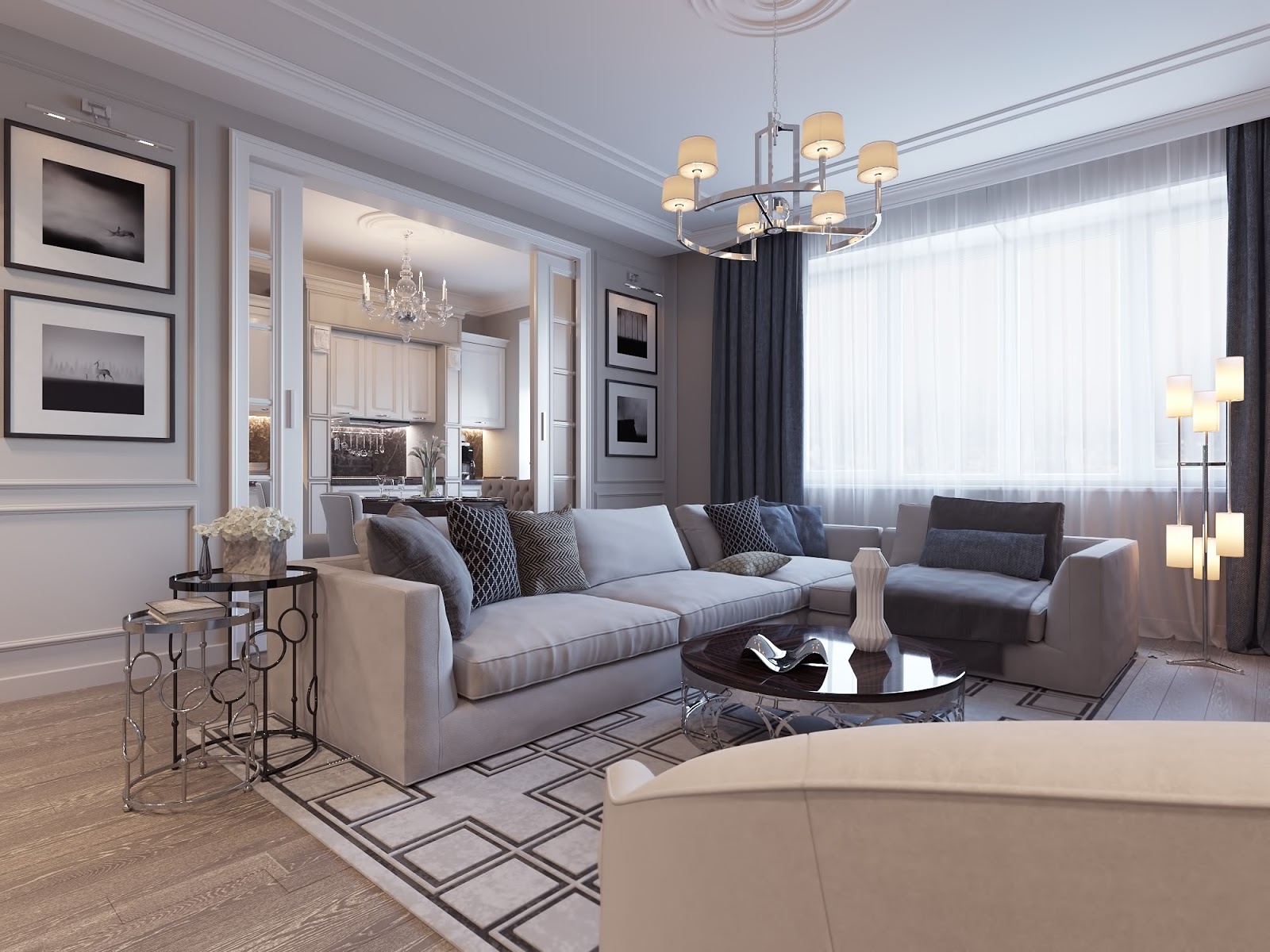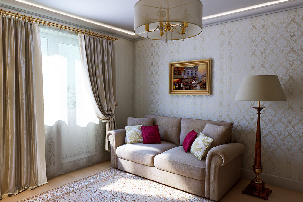 Le style classique léger est parfait pour l'intérieur d'un petit salon dans une maison ou un appartement. Pour une décoration de style néoclassique, choisissez de beaux meubles chers dans un style contemporain de sable, des tons marron, beiges ou gris, des armoires lumineuses ou des étagères en bois clair, des suspensions élégantes, des rideaux couleur lait, des tables basses sur pieds sculptés, des peintures et des vases profilés transparents formes.