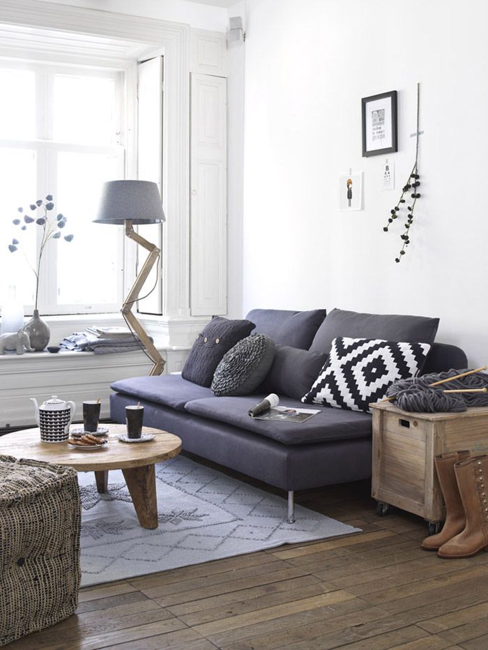 Les couleurs les plus adaptées au style scandinave: toutes les nuances de bleu et gris, jaune et rouge en sourdine, lilas, couleur verte.